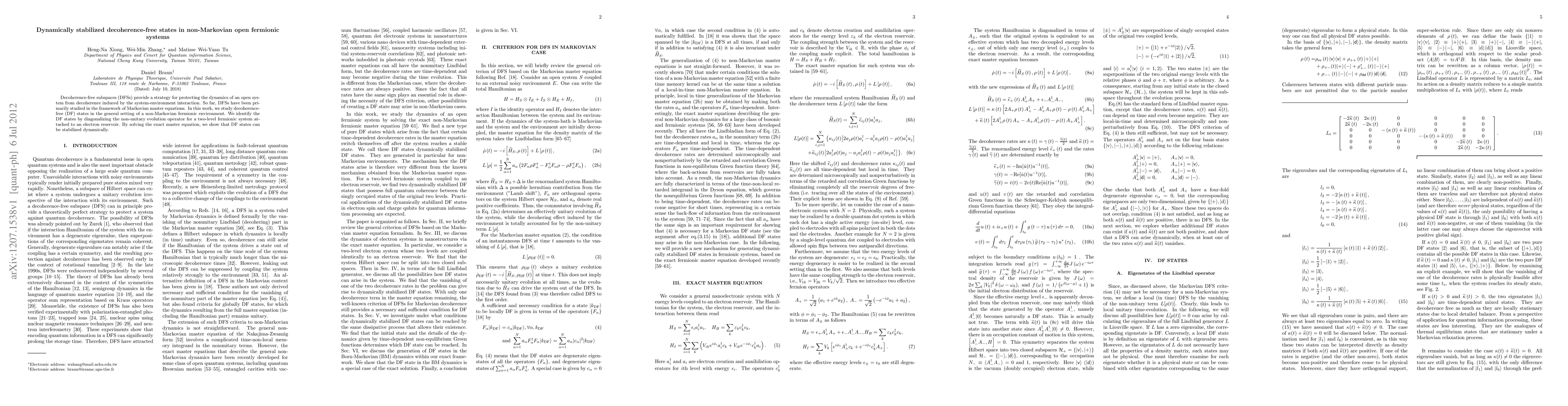 This paper investigates decoherence-free states (DFSs) in non-Markovian fermionic systems, identifying these states through the non-unitary evolution operator. It demonstrates that DFSs can be dynamically stabilized, extending beyond the traditional Markovian framework.