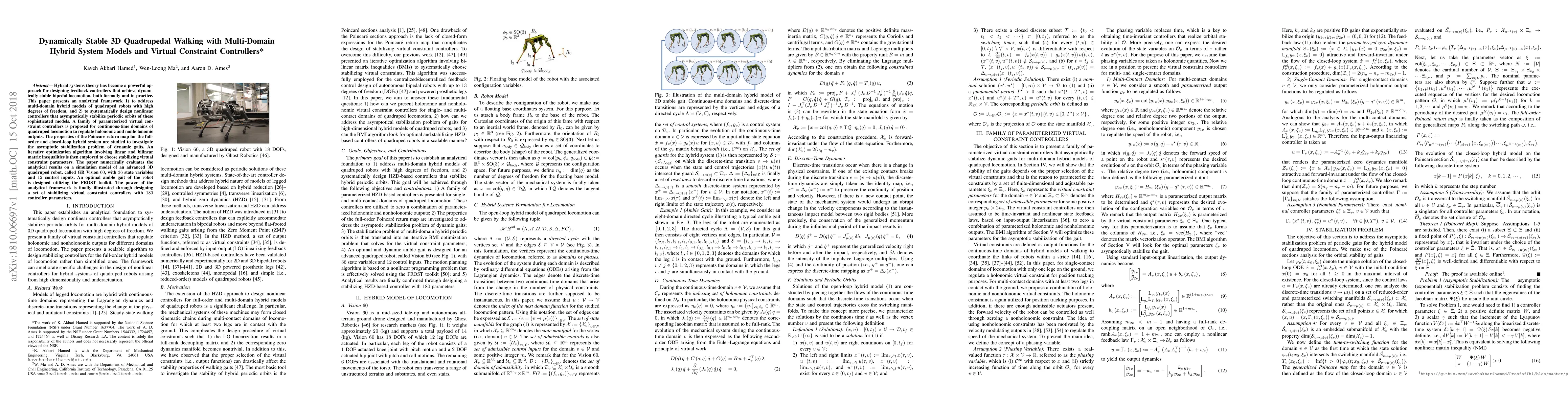 Hybrid systems theory has become a powerful approach for designing feedback controllers that achieve dynamically stable bipedal locomotion, both formally and in practice. This paper presents an analytical framework 1) to address multi-domain hybrid models of quadruped robots with high degrees of freedom, and 2) to systematically design nonlinear controllers that asymptotically stabilize periodic orbits of these sophisticated models. A family of parameterized virtual constraint controllers is proposed for continuous-time domains of quadruped locomotion to regulate holonomic and nonholonomic outputs. The properties of the Poincare return map for the full-order and closed-loop hybrid system are studied to investigate the asymptotic stabilization problem of dynamic gaits. An iterative optimization algorithm involving linear and bilinear matrix inequalities is then employed to choose stabilizing virtual constraint parameters. The paper numerically evaluates the analytical results on a simulation model of an advanced 3D quadruped robot, called GR Vision 60, with 36 state variables and 12 control inputs. An optimal amble gait of the robot is designed utilizing the FROST toolkit. The power of the analytical framework is finally illustrated through designing a set of stabilizing virtual constraint controllers with 180 controller parameters.