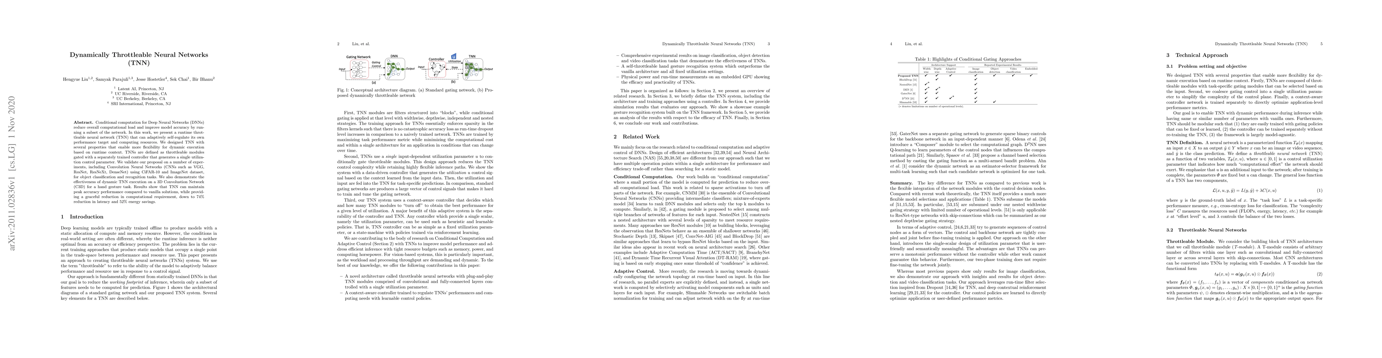 This paper introduces a dynamically throttleable neural network (TNN) that adaptively adjusts its performance and resource usage based on runtime conditions. The TNN employs a controller to regulate its computational load, achieving significant reductions in latency and energy consumption while maintaining high accuracy across various CNNs and tasks.