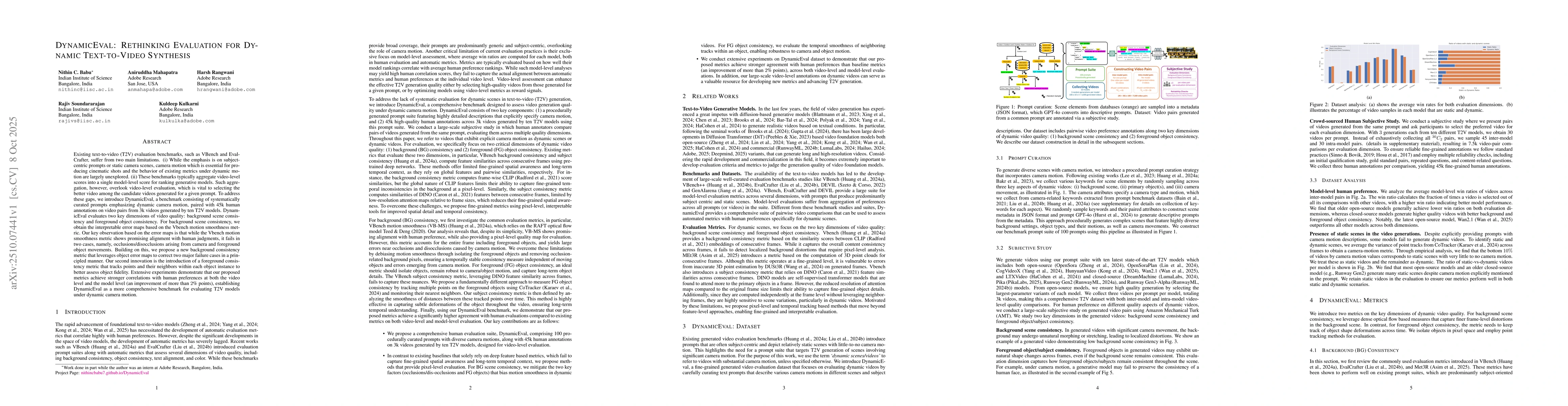 Existing text-to-video (T2V) evaluation benchmarks, such as VBench and EvalCrafter, suffer from two limitations. (i) While the emphasis is on subject-centric prompts or static camera scenes, camera motion essential for producing cinematic shots and existing metrics under dynamic motion are largely unexplored. (ii) These benchmarks typically aggregate video-level scores into a single model-level score for ranking generative models. Such aggregation, however, overlook video-level evaluation, which is vital to selecting the better video among the candidate videos generated for a given prompt. To address these gaps, we introduce DynamicEval, a benchmark consisting of systematically curated prompts emphasizing dynamic camera motion, paired with 45k human annotations on video pairs from 3k videos generated by ten T2V models. DynamicEval evaluates two key dimensions of video quality: background scene consistency and foreground object consistency. For background scene consistency, we obtain the interpretable error maps based on the Vbench motion smoothness metric. We observe that while the Vbench motion smoothness metric shows promising alignment with human judgments, it fails in two cases: occlusions/disocclusions arising from camera and foreground object movements. Building on this, we propose a new background consistency metric that leverages object error maps to correct two failure cases in a principled manner. Our second innovation is the introduction of a foreground consistency metric that tracks points and their neighbors within each object instance to assess object fidelity. Extensive experiments demonstrate that our proposed metrics achieve stronger correlations with human preferences at both the video level and the model level (an improvement of more than 2% points), establishing DynamicEval as a more comprehensive benchmark for evaluating T2V models under dynamic camera motion.