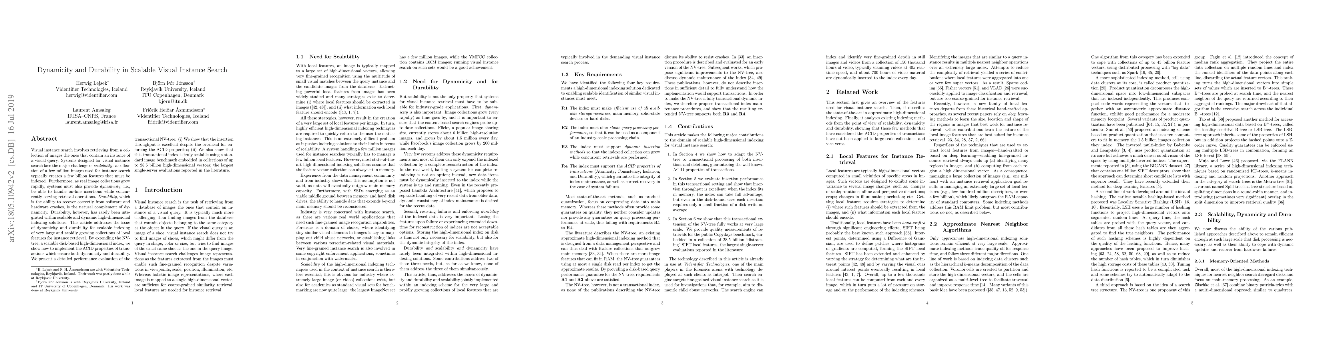Visual instance search involves retrieving from a collection of images the ones that contain an instance of a visual query. Systems designed for visual instance search face the major challenge of scalability: a collection of a few million images used for instance search typically creates a few billion features that must be indexed. Furthermore, as real image collections grow rapidly, systems must also provide dynamicity, i.e., be able to handle on-line insertions while concurrently serving retrieval operations. Durability, which is the ability to recover correctly from software and hardware crashes, is the natural complement of dynamicity. Durability, however, has rarely been integrated within scalable and dynamic high-dimensional indexing solutions. This article addresses the issue of dynamicity and durability for scalable indexing of very large and rapidly growing collections of local features for instance retrieval. By extending the NV-tree, a scalable disk-based high-dimensional index, we show how to implement the ACID properties of transactions which ensure both dynamicity and durability. We present a detailed performance evaluation of the transactional NV-tree: (i) We show that the insertion throughput is excellent despite the overhead for enforcing the ACID properties; (ii) We also show that this transactional index is truly scalable using a standard image benchmark embedded in collections of up to 28.5 billion high-dimensional vectors; the largest single-server evaluations reported in the literature.