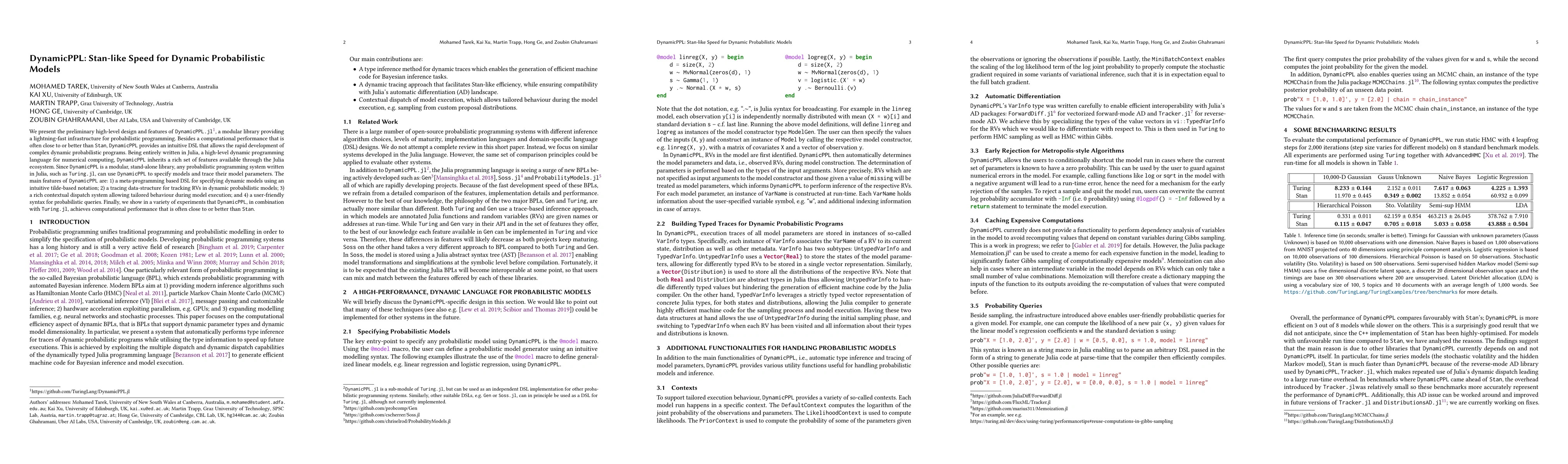 We present the preliminary high-level design and features of DynamicPPL.jl, a modular library providing a lightning-fast infrastructure for probabilistic programming. Besides a computational performance that is often close to or better than Stan, DynamicPPL provides an intuitive DSL that allows the rapid development of complex dynamic probabilistic programs. Being entirely written in Julia, a high-level dynamic programming language for numerical computing, DynamicPPL inherits a rich set of features available through the Julia ecosystem. Since DynamicPPL is a modular, stand-alone library, any probabilistic programming system written in Julia, such as Turing.jl, can use DynamicPPL to specify models and trace their model parameters. The main features of DynamicPPL are: 1) a meta-programming based DSL for specifying dynamic models using an intuitive tilde-based notation; 2) a tracing data-structure for tracking RVs in dynamic probabilistic models; 3) a rich contextual dispatch system allowing tailored behaviour during model execution; and 4) a user-friendly syntax for probabilistic queries. Finally, we show in a variety of experiments that DynamicPPL, in combination with Turing.jl, achieves computational performance that is often close to or better than Stan.
