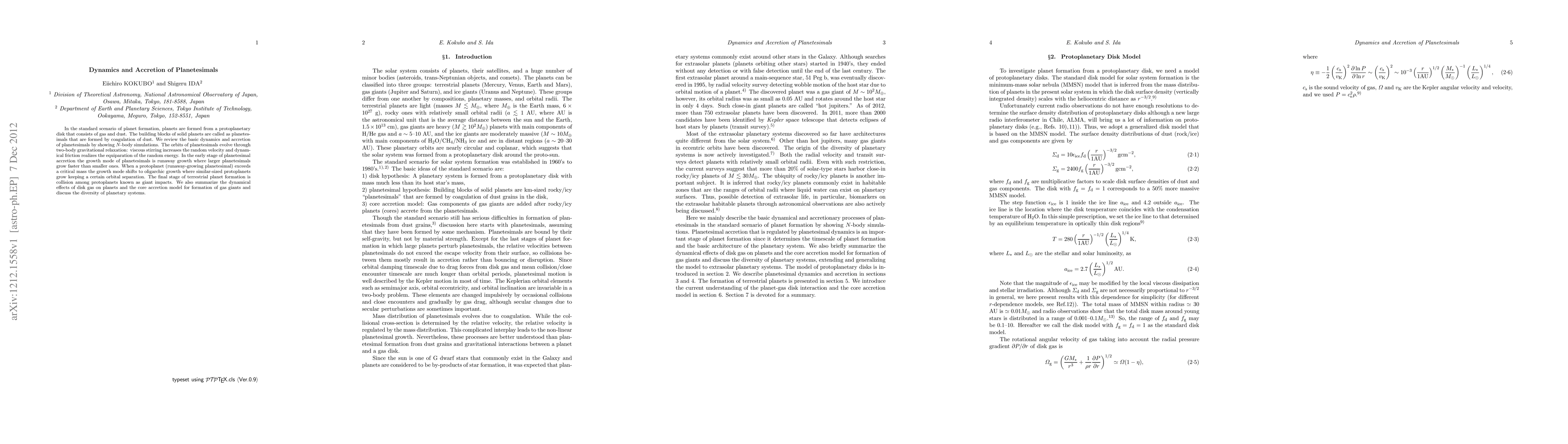 This paper reviews the dynamics and accretion processes of planetesimals through N-body simulations, detailing how gravitational relaxation leads to their evolution and eventual terrestrial planet formation via giant impacts. It also discusses the transition from runaway to oligarchic growth and the influence of disk gas on planet formation.
