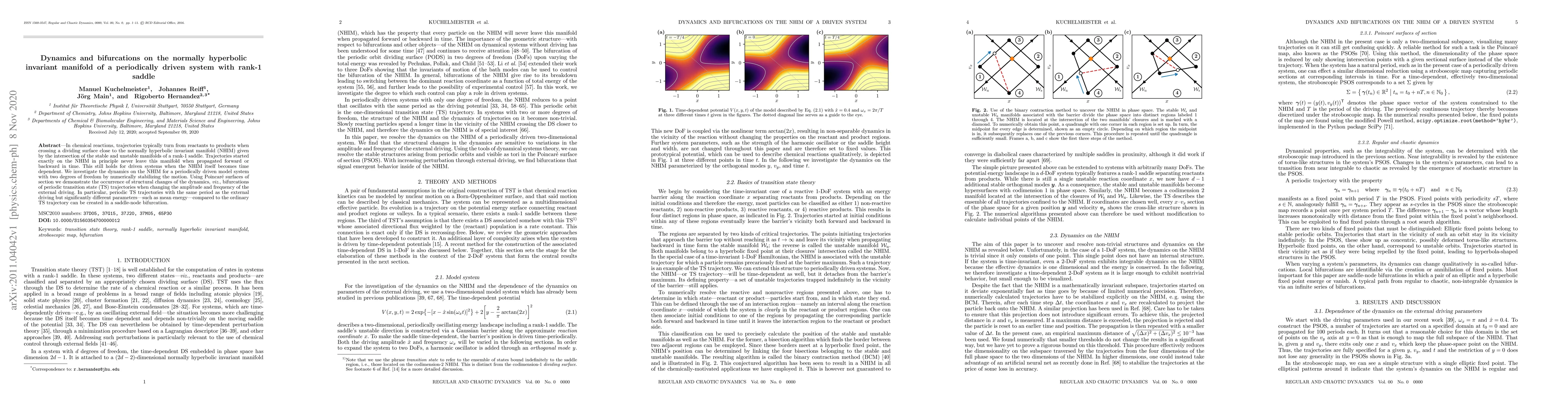 In chemical reactions, trajectories typically turn from reactants to products when crossing a dividing surface close to the normally hyperbolic invariant manifold (NHIM) given by the intersection of the stable and unstable manifolds of a rank-1 saddle. Trajectories started exactly on the NHIM in principle never leave this manifold when propagated forward or backward in time. This still holds for driven systems when the NHIM itself becomes time dependent. We investigate the dynamics on the NHIM for a periodically driven model system with two degrees of freedom by numerically stabilizing the motion. Using Poincar\'e surfaces of section we demonstrate the occurrence of structural changes of the dynamics, \emph{viz.}, bifurcations of periodic transition state (TS) trajectories when changing the amplitude and frequency of the external driving. In particular, periodic TS trajectories with the same period as the external driving but significantly different parameters---such as mean energy---compared to the ordinary TS trajectory can be created in a saddle-node bifurcation.