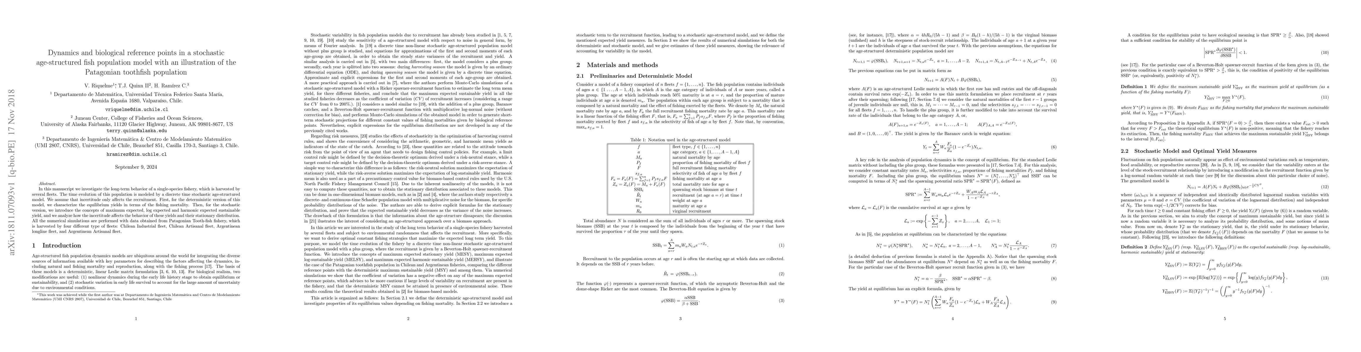 This paper explores the dynamics of a stochastic age-structured fish population model for the Patagonian toothfish, analyzing equilibrium yields and sustainable yield concepts under uncertainty affecting recruitment. It characterizes the long-term behavior of a multi-fleet fishery using data from four distinct fishing fleets.