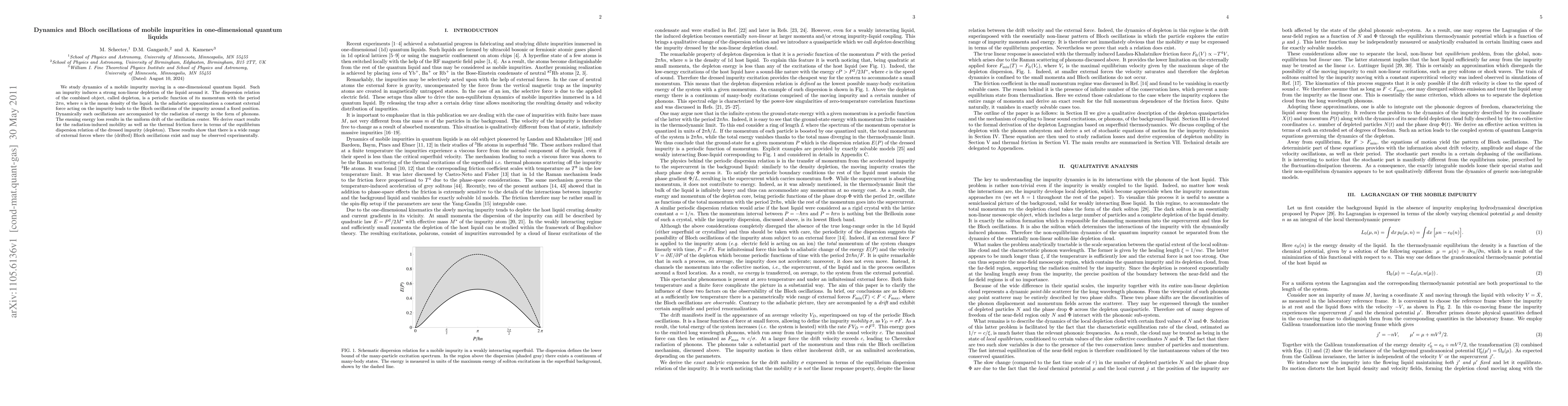 Researchers studied a mobile impurity in a 1D quantum liquid, finding it induces non-linear depletion and causes Bloch oscillations with radiation-induced energy loss, resulting in uniform drift of the oscillation center.