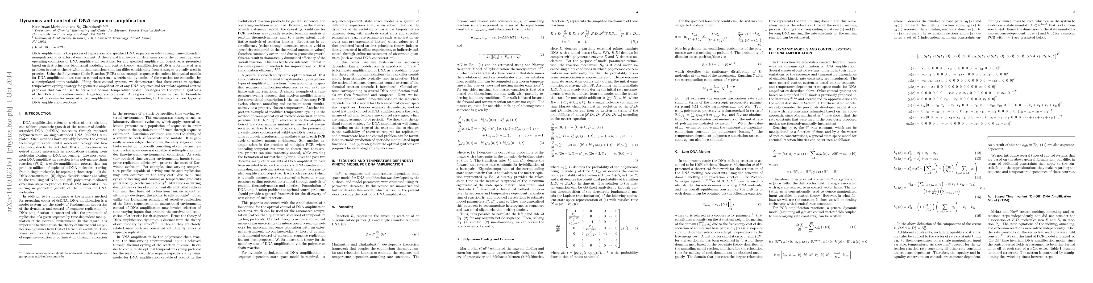 This paper presents a theoretical framework for optimizing DNA amplification reactions using control theory, demonstrating that optimal temperature cycling strategies can significantly differ from conventional methods. It formulates DNA amplification as a control problem, proposing optimal synthesis strategies for achieving desired amplification objectives.