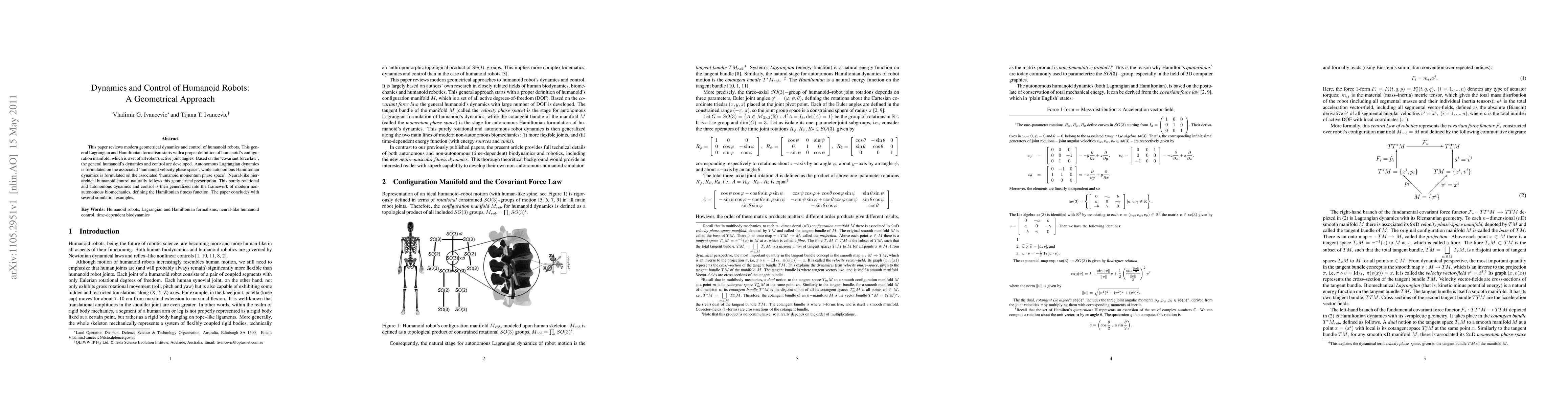 his paper reviews modern geometrical dynamics and control of humanoid robots. This general Lagrangian and Hamiltonian formalism starts with a proper definition of humanoid's configuration manifold, which is a set of all robot's active joint angles. Based on the `covariant force law', the general humanoid's dynamics and control are developed. Autonomous Lagrangian dynamics is formulated on the associated `humanoid velocity phase space', while autonomous Hamiltonian dynamics is formulated on the associated `humanoid momentum phase space'. Neural-like hierarchical humanoid control naturally follows this geometrical prescription. This purely rotational and autonomous dynamics and control is then generalized into the framework of modern non-autonomous biomechanics, defining the Hamiltonian fitness function. The paper concludes with several simulation examples. Keywords: Humanoid robots, Lagrangian and Hamiltonian formalisms, neural-like humanoid control, time-dependent biodynamics
