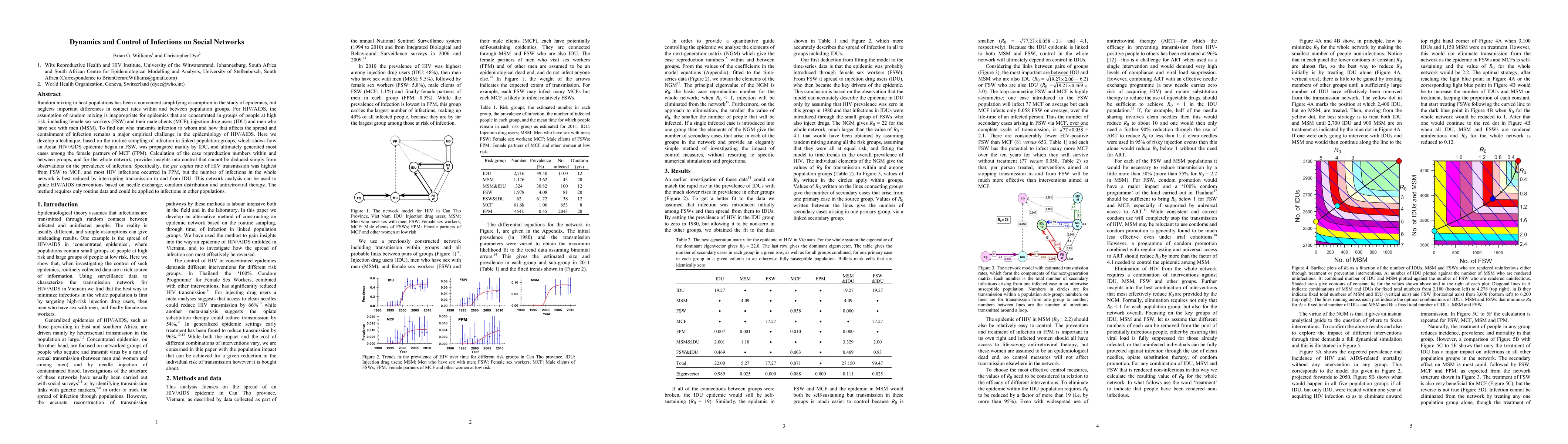 Random mixing in host populations has been a convenient simplifying assumption in the study of epidemics, but neglects important differences in contact rates within and between population groups. For HIV/AIDS, the assumption of random mixing is inappropriate for epidemics that are concentrated in groups of people at high risk, including female sex workers (FSW) and their male clients (MCF), injection drug users (IDU) and men who have sex with men (MSM). To find out who transmits infection to whom and how that affects the spread and containment of infection remains a major empirical challenge in the epidemiology of HIV/AIDS. Here we develop a technique, based on the routine sampling of infection in linked population groups, which shows how an Asian HIV/AIDS epidemic began in FSW, was propagated mainly by IDU, and ultimately generated most cases among the female partners of MCF (FPM). Calculation of the case reproduction numbers within and between groups, and for the whole network, provides insights into control that cannot be deduced simply from observations on the prevalence of infection. Specifically, the per capita rate of HIV transmission was highest from FSW to MCF, and most HIV infections occurred in FPM, but the number of infections in the whole network is best reduced by interrupting transmission to and from IDU. This network analysis can be used to guide HIV/AIDS interventions based on needle exchange, condom distribution and antiretroviral therapy. The method requires only routine data and could be applied to infections in other populations.
