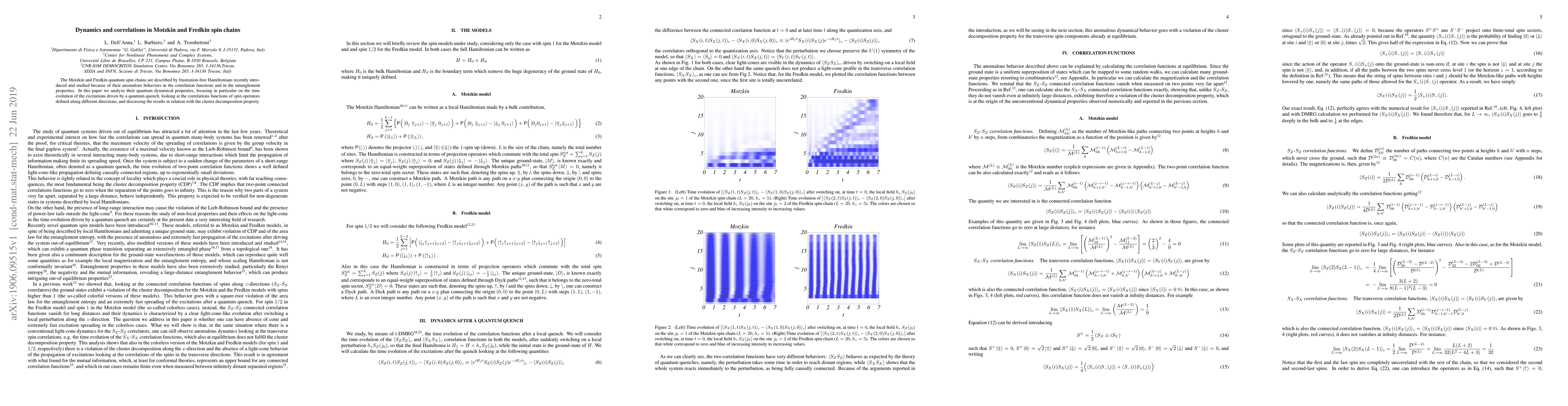 This paper investigates the dynamics and correlations in Motzkin and Fredkin spin chains, focusing on the time evolution of excitations post-quantum quench, and examines the correlation functions of spin operators in relation to the cluster decomposition property.