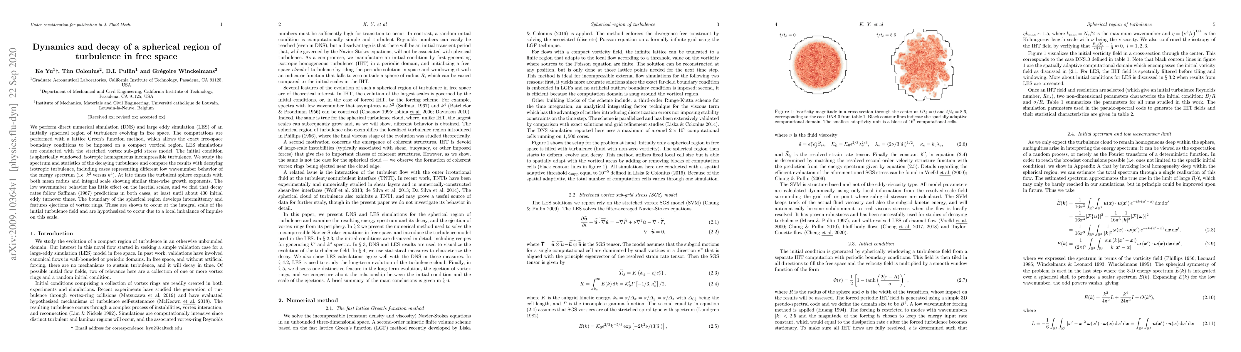 We perform direct numerical simulation (DNS) and large eddy simulation (LES) of an initially spherical region of turbulence evolving in free space. The computations are performed with a lattice Green's function method, which allows the exact free-space boundary conditions to be imposed on a compact vortical region. LES simulations are conducted with the stretched vortex sub-grid stress model. The initial condition is spherically windowed, isotropic homogeneous incompressible turbulence. We study the spectrum and statistics of the decaying turbulence and compare the results with decaying isotropic turbulence, including cases representing different low wavenumber behavior of the energy spectrum (i.e. k^2 versus k^4). At late times the turbulent sphere expands with both mean radius and integral scale showing similar time-wise growth exponents. The low wavenumber behavior has little effect on the inertial scales, and we find that decay rates follow Saffman (1967) predictions in both cases, at least until about 400 initial eddy turnover times. The boundary of the spherical region develops intermittency and features ejections of vortex rings. These are shown to occur at the integral scale of the initial turbulence field and are hypothesized to occur due to a local imbalance of impulse on this scale.