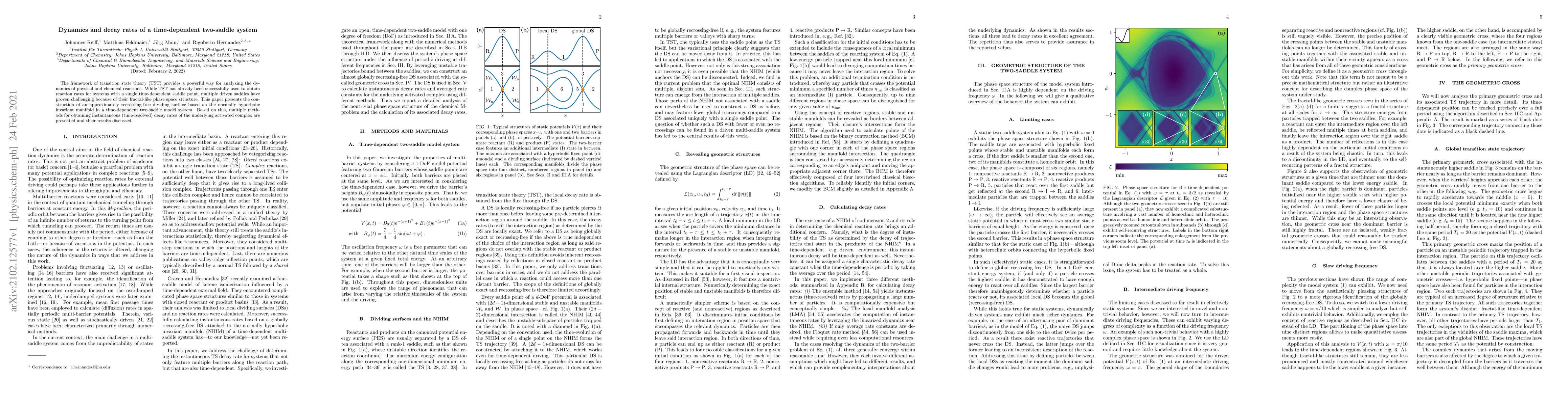 This paper develops a method for analyzing the dynamics of time-dependent two-saddle systems using transition state theory, constructing an approximately recrossing-free dividing surface based on the normally hyperbolic invariant manifold. It also presents multiple techniques for determining instantaneous decay rates of the activated complex and discusses their outcomes.