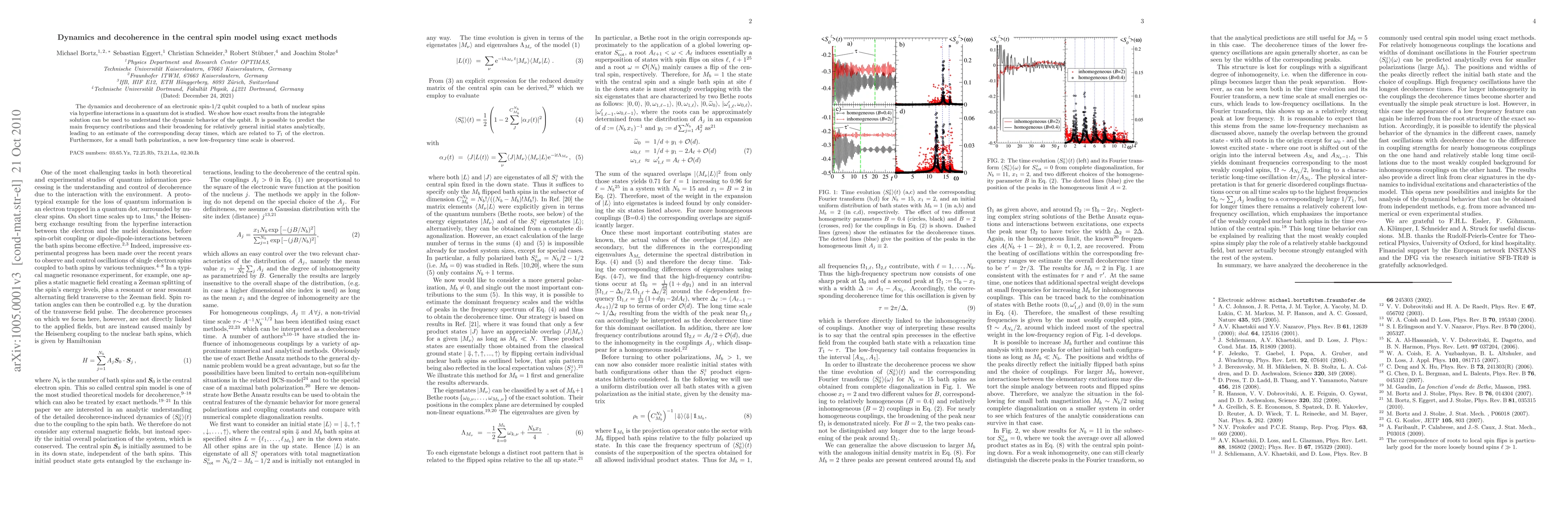 This study uses exact methods to analyze the dynamics and decoherence of a quantum dot qubit coupled to a bath of nuclear spins. It predicts main frequency contributions and decay times for various initial states, revealing a new low-frequency time scale for small bath polarization.