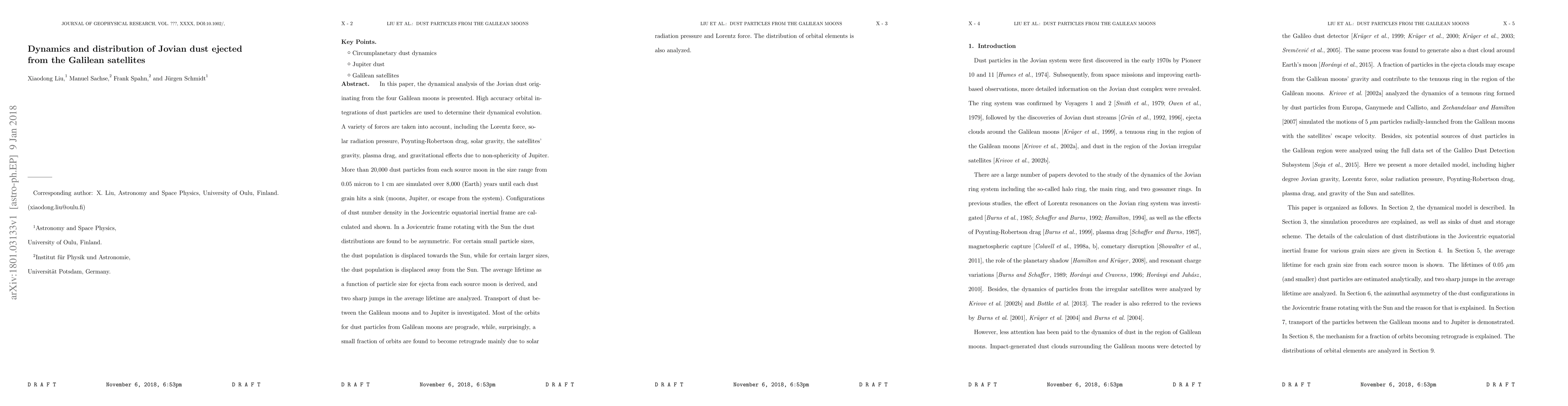 This paper analyzes the dynamics and distribution of Jovian dust ejected from the Galilean moons using high-accuracy orbital simulations. It reveals asymmetric dust distributions in the Jovicentric frame, with size-dependent displacements towards or away from the Sun, and investigates the transport and orbital evolution of dust particles.