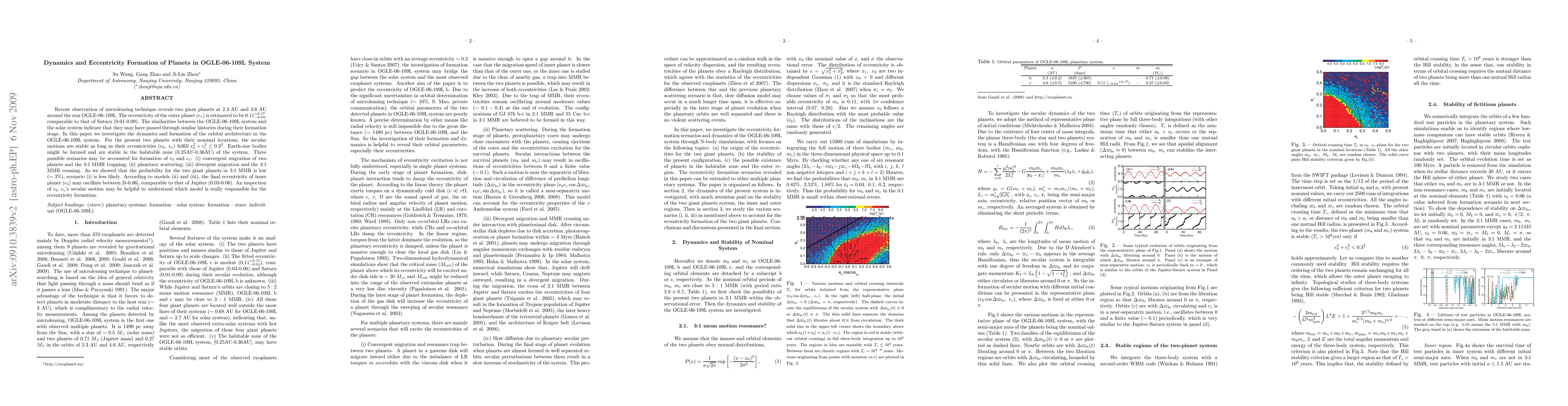 Recent observation of microlensing technique reveals two giant planets at 2.3 AU and 4.6 AU around the star OGLE-06-109L. The eccentricity of the outer planet (ec) is estimated to be 0.11(+0.17,-0.04), comparable to that of Saturn (0.01-0.09). The similarities between the OGLE-06-109L system and the solar system indicate that they may have passed through similar histories during their formation stage. In this paper we investigate the dynamics and formation of the orbital architecture in the OGLE-06-109L system. For the present two planets with their nominal locations, the secular motions are stable as long as their eccentricities (eb; ec) fulfill eb^2 + ec^2 < = 0.3^2. Earth-size bodies might be formed and are stable in the habitable zone (0.25AU-0.36AU) of the system. Three possible scenarios may be accounted for formation of eb and ec: (i) convergent migration of two planets and the 3:1 MMR trapping; (ii) planetary scattering; (iii) divergent migration and the 3:1 MMR crossing. As we showed that the probability for the two giant planets in 3:1 MMR is low (~3%), scenario (i) is less likely. According to models (ii) and (iii), the final eccentricity of inner planet (eb) may oscillate between [0-0.06], comparable to that of Jupiter (0.03-0.06). An inspection of eb, ec secular motion may be helpful to understand which model is really responsible for the eccentricity formation.