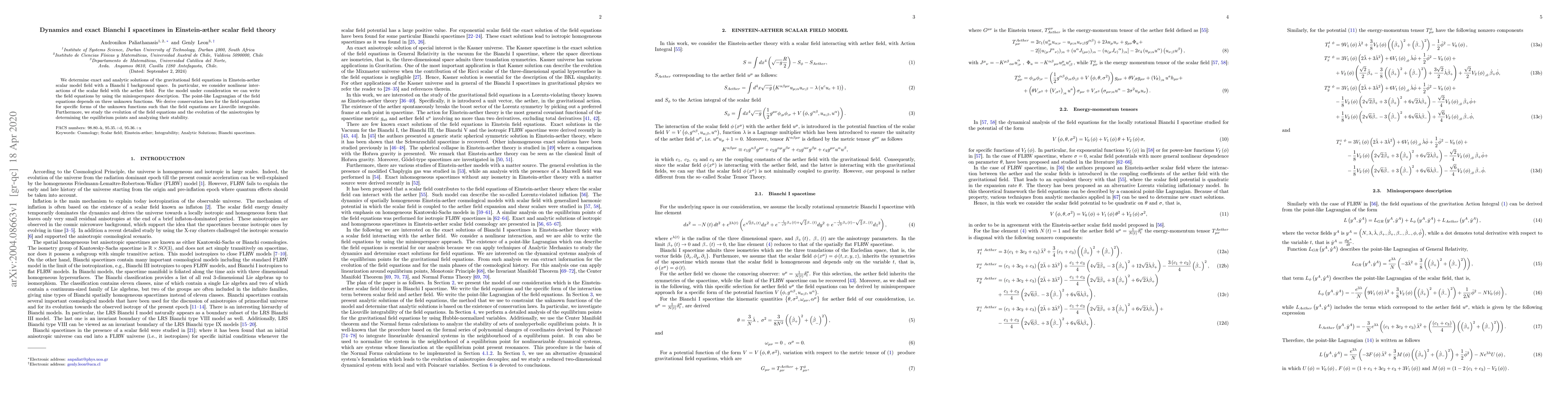 This paper finds exact solutions for Einstein-aether scalar field theory in a Bianchi I spacetime, exploring nonlinear interactions and deriving conservation laws. It also analyzes the stability of equilibrium points to study the evolution of anisotropies.