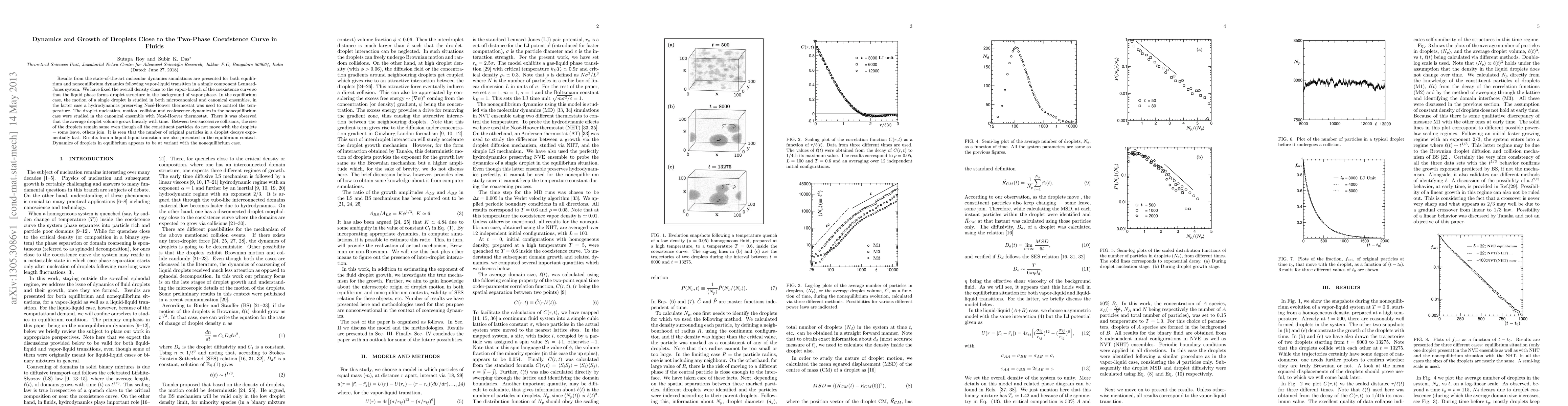 This paper uses molecular dynamics simulations to study droplet formation and dynamics near the vapor-liquid coexistence curve in a Lennard-Jones fluid. Equilibrium dynamics show droplet motion in microcanonical and canonical ensembles, while nonequilibrium dynamics reveal linear growth in droplet volume and exponential decay in original particle count between collisions.