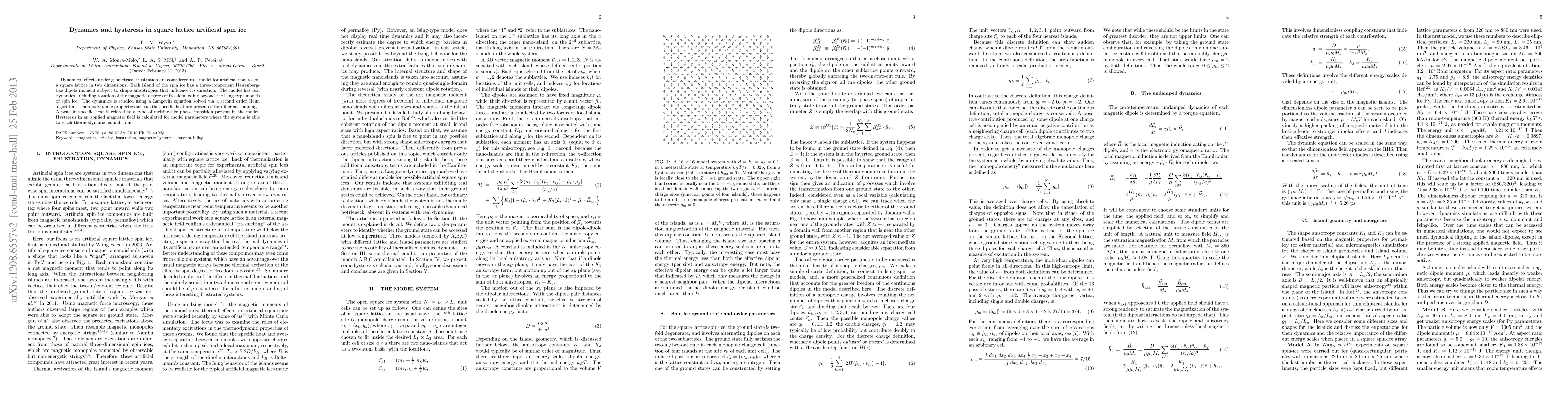 Dynamical effects under geometrical frustration are considered in a model for artificial spin ice on a square lattice in two dimensions. Each island of the spin ice has a three-component Heisenberg-like dipole moment subject to shape anisotropies that influence its direction. The model has real dynamics, including rotation of the magnetic degrees of freedom, going beyond the Ising-type models of spin ice. The dynamics is studied using a Langevin equation solved via a second order Heun algorithm. Thermodynamic properties such as the specific heat are presented for different couplings. A peak in specific heat is related to a type of melting-like phase transition present in the model. Hysteresis in an applied magnetic field is calculated for model parameters where the system is able to reach thermodynamic equilibrium.