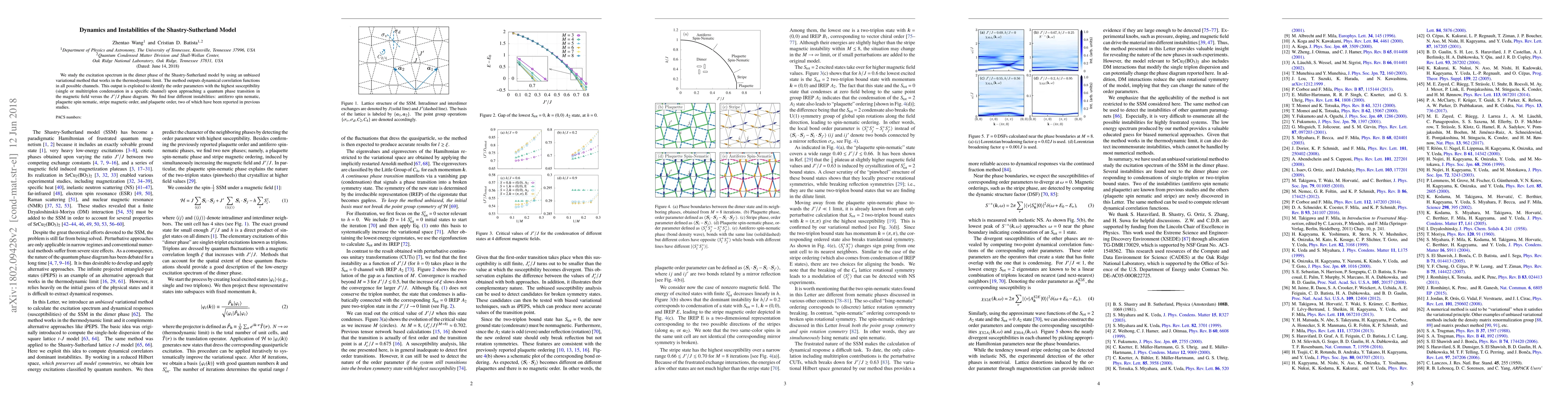 This paper investigates the excitation spectrum in the dimer phase of the Shastry-Sutherland model using an unbiased variational method, identifying four distinct instabilities: antiferro spin nematic, plaquette spin nematic, stripe magnetic order, and plaquette order, with two previously reported.
