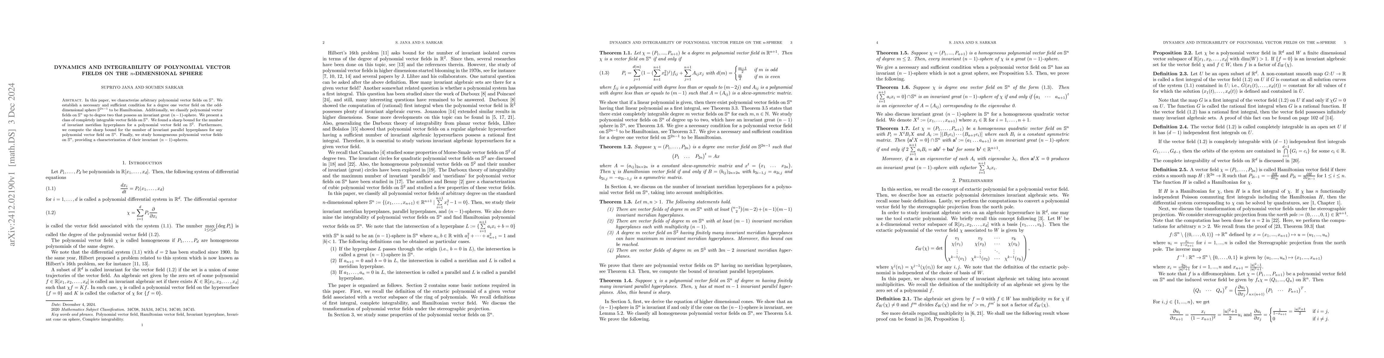 This paper characterizes polynomial vector fields on the $n$-dimensional sphere $S^n$, providing a necessary and sufficient condition for degree one Hamiltonian vector fields on $S^{2n-1}$. It classifies degree two fields with invariant great $(n-1)$-spheres and identifies completely integrable vector fields on $S^n$, along with sharp bounds for invariant hyperplanes and characterizations of invariant $(n-1)$-spheres for homogeneous fields.