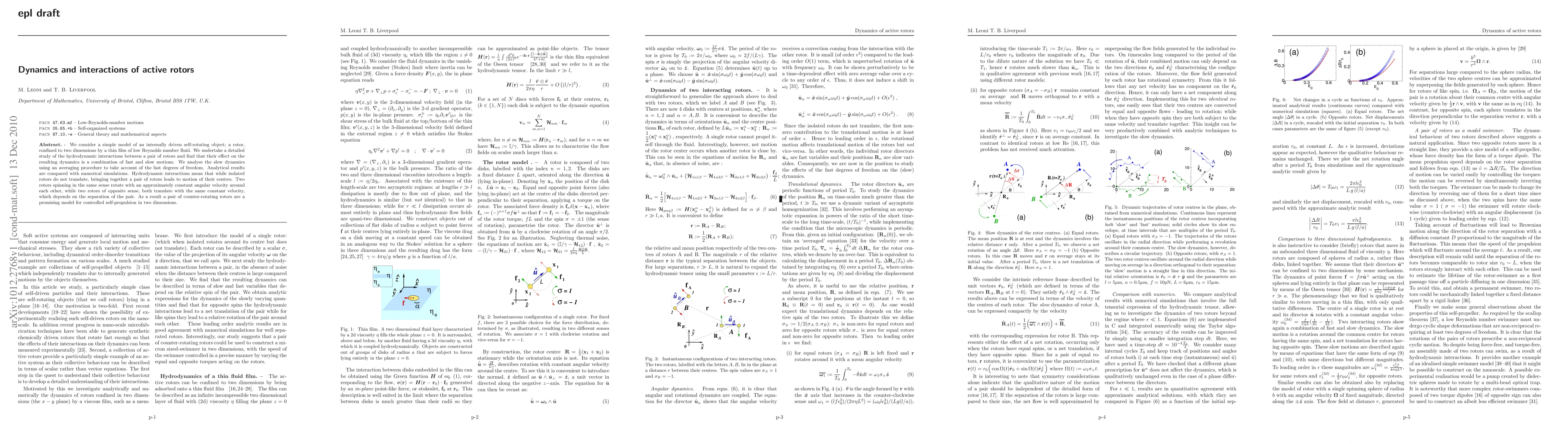 This paper explores the dynamics of two-dimensional self-rotating rotors in a low Reynolds number fluid, revealing complex hydrodynamic interactions. It finds that while isolated rotors do not translate, pairs exhibit either rotational or translational motion depending on their spin direction, suggesting potential for controlled self-propulsion.