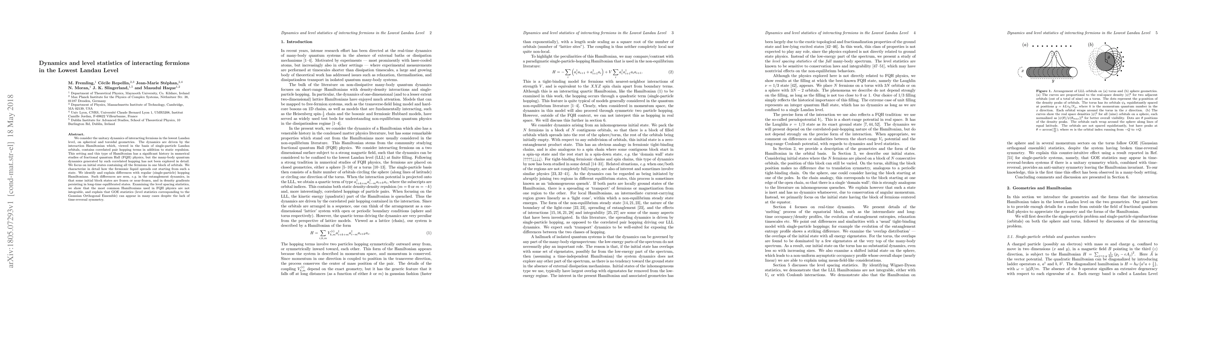 This paper explores the unitary dynamics of interacting fermions in the lowest Landau level, focusing on how initial states evolve and spread out under a correlated pair hopping Hamiltonian. The study reveals unique dynamics, including frozen initial states and persistent density gradients, and shows that despite the lack of time-reversal symmetry, GOE statistics can emerge in level spacing.
