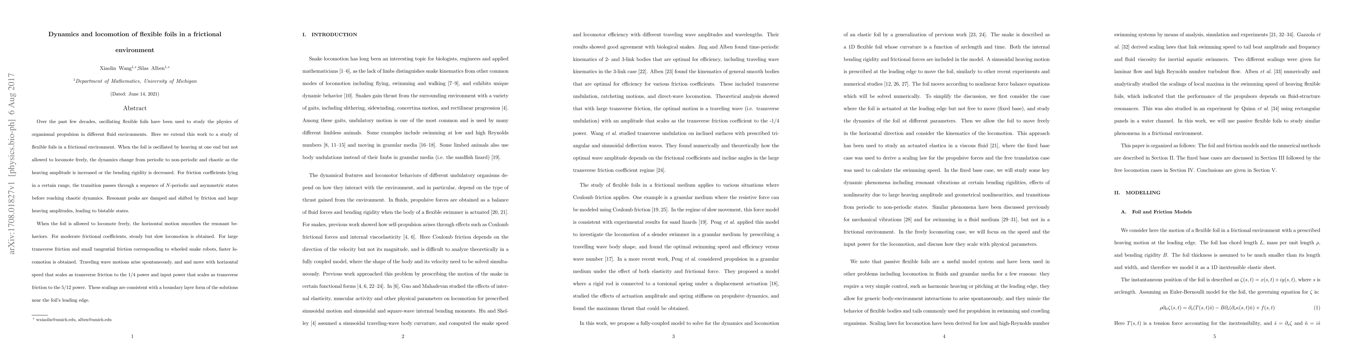 This paper investigates the dynamics and locomotion of flexible foils in a frictional environment, showing that friction induces transitions from periodic to chaotic motion when the foil is oscillated without free movement. When allowed to locomote freely, the foil exhibits steady but slow movement under moderate friction, and faster locomotion under high transverse friction, with traveling wave motions scaling with friction and input power.