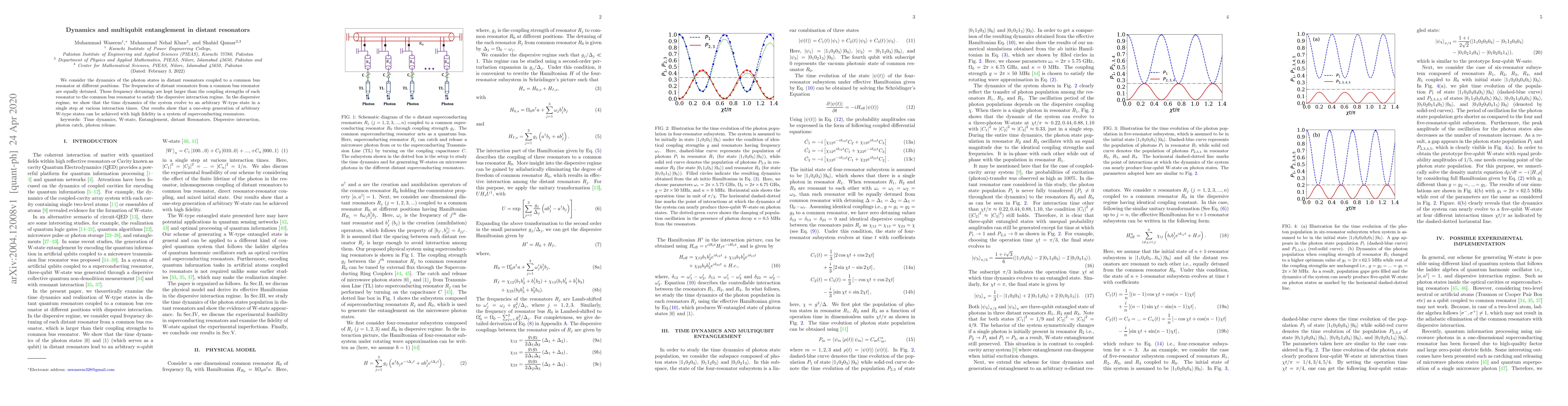 This paper investigates the dynamics of photon states in distant resonators coupled to a common bus resonator, demonstrating the generation of arbitrary W-type states in a single step under the dispersive interaction regime. The study shows high fidelity in creating these states using superconducting resonators.