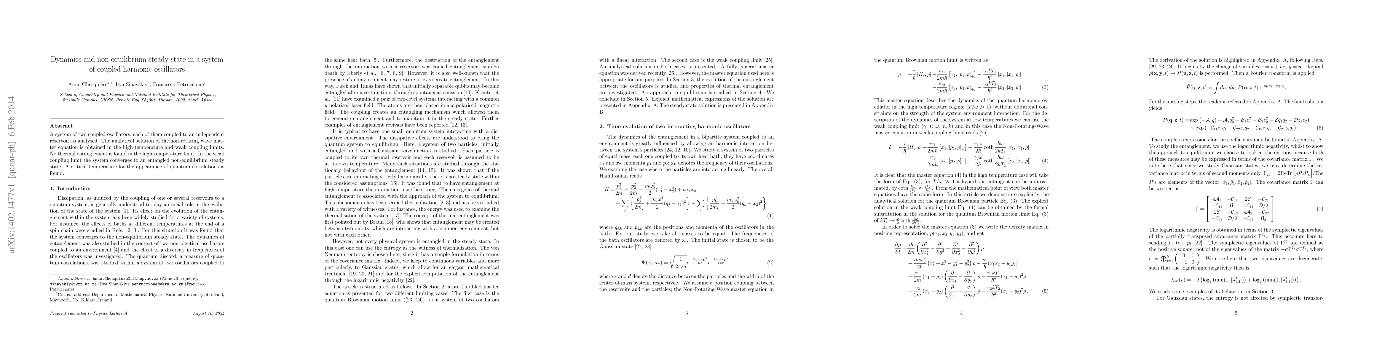 This paper analyzes a system of two coupled harmonic oscillators, each connected to separate reservoirs, revealing that it converges to an entangled non-equilibrium steady state under weak coupling, while no thermal entanglement occurs in the high-temperature limit. A critical temperature is identified for the emergence of quantum correlations.