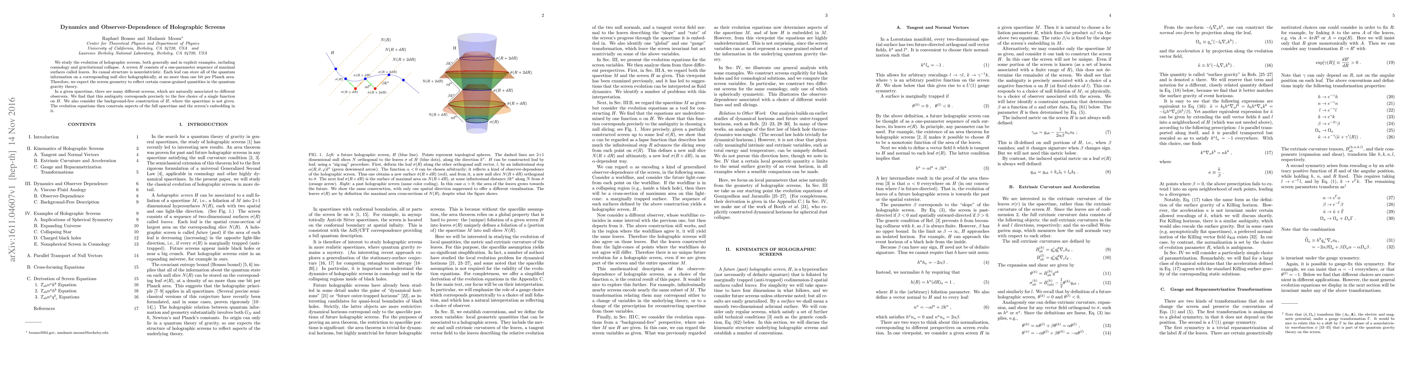 We study the evolution of holographic screens, both generally and in explicit examples, including cosmology and gravitational collapse. A screen $H$ consists of a one-parameter sequence of maximal surfaces called leaves. Its causal structure is nonrelativistic. Each leaf can store all of the quantum information on a corresponding null slice holographically, at no more than one bit per Planck area. Therefore, we expect the screen geometry to reflect certain coarse-grained quantities in the quantum gravity theory. In a given spacetime, there are many different screens, which are naturally associated to different observers. We find that this ambiguity corresponds precisely to the free choice of a single function on $H$. We also consider the background-free construction of $H$, where the spacetime is not given. The evolution equations then constrain aspects of the full spacetime and the screen's embedding in it.