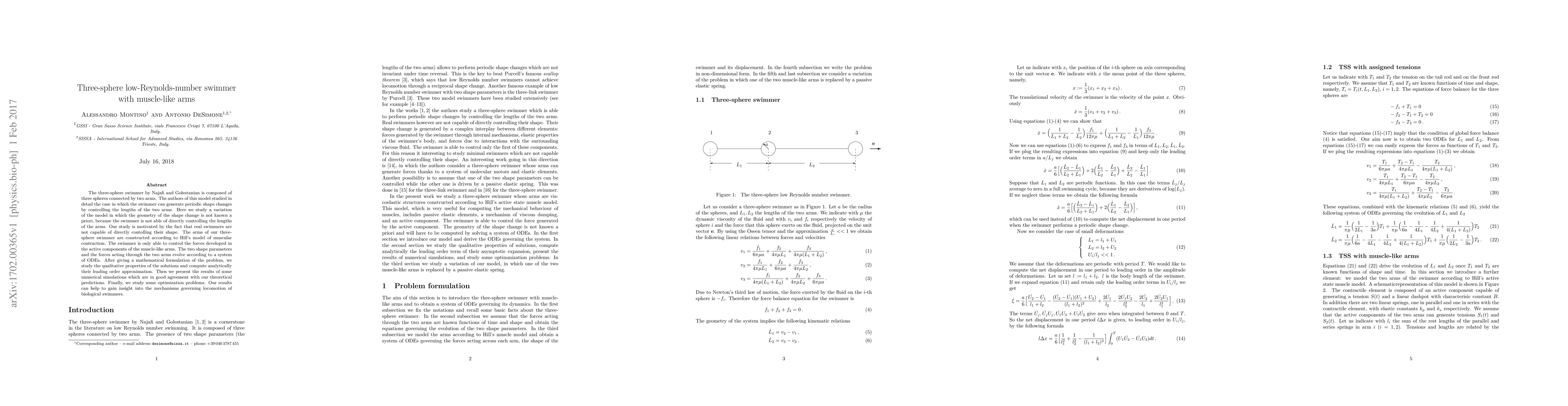 This paper investigates a three-sphere swimmer with muscle-like arms, focusing on the dynamics and optimal actuation strategies. It formulates and solves optimization problems to maximize performance, comparing analytical approximations with numerical simulations and discussing the control affine nature of the system.