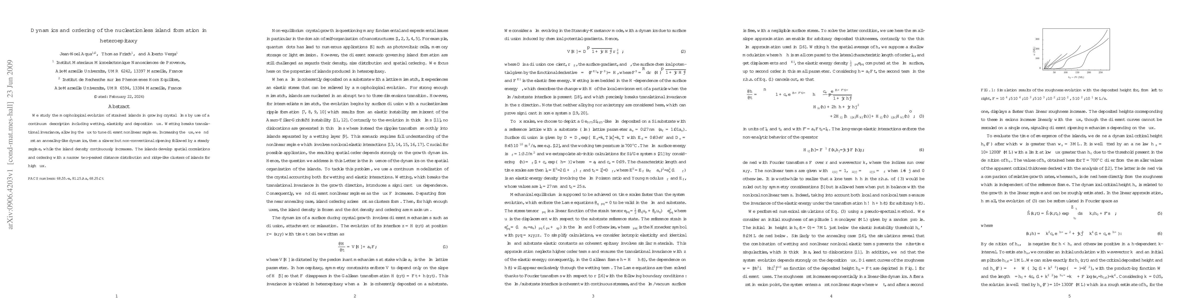 We study the morphological evolution of strained islands in growing crystal films by use of a continuum description including wetting, elasticity and deposition flux. Wetting breaks translational invariance, allowing the flux to tune different nonlinear regimes. Increasing the flux, we find first an annealing-like dynamics, then a slower but non-conventional ripening followed by a steady regime, while the island density continuously increases. The islands develop spatial correlations and ordering with a narrow two-peaked distance distribution and ridge-like clusters of islands for high flux.