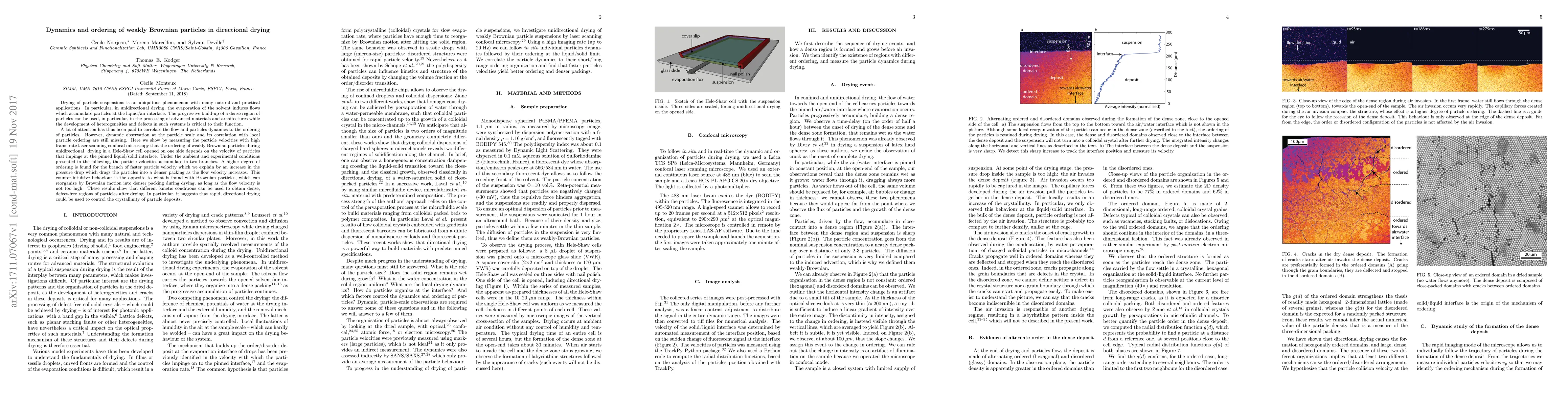 This paper investigates the dynamics and ordering of weakly Brownian particles during unidirectional drying, revealing that faster particle velocities lead to higher particle ordering due to increased pressure drop, contrary to the behavior of Brownian particles. The findings suggest that rapid, directional drying can control the crystallinity of particle deposits.