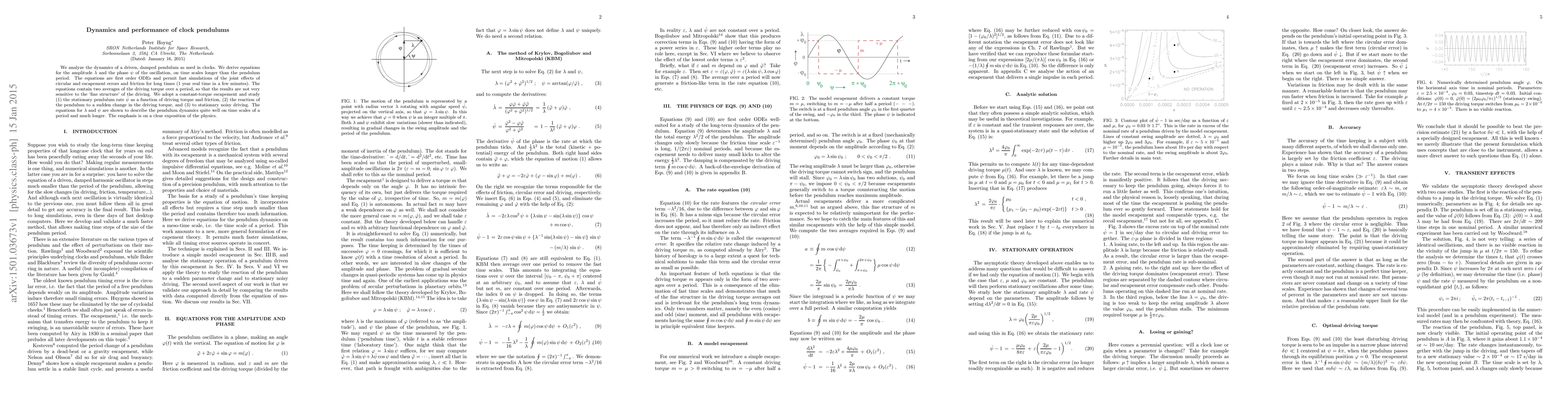 This paper derives first-order ODEs to model the dynamics of driven, damped clock pendulums, focusing on amplitude and phase over long time scales. It examines the effects of escapement errors, friction, and disturbances, demonstrating the equations' robustness to driving torque variations.
