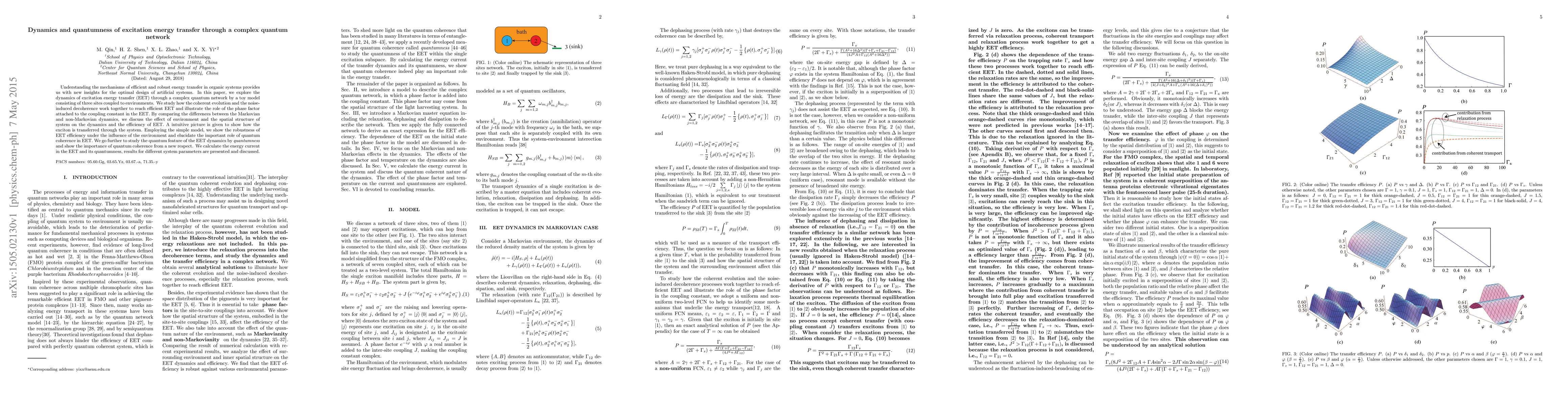 Understanding the mechanisms of efficient and robust energy transfer in organic systems provides us with new insights for the optimal design of artificial systems. In this paper, we explore the dynamics of excitation energy transfer (EET) through a complex quantum network by a toy model consisting of three sites coupled to environments. We study how the coherent evolution and the noise-induced decoherence work together to reach efficient EET and illustrate the role of the phase factor attached to the coupling constant in the EET. By comparing the differences between the Markovian and non-Markovian dynamics, we discuss the effect of environment and the spatial structure of system on the dynamics and the efficiency of EET. A intuitive picture is given to show how the exciton is transferred through the system. Employing the simple model, we show the robustness of EET efficiency under the influence of the environment and elucidate the important role of quantum coherence in EET. We go further to study the quantum feature of the EET dynamics by {\it quantumness} and show the importance of quantum coherence from a new respect. We calculate the energy current in the EET and its quantumness, results for different system parameters are presented and discussed.
