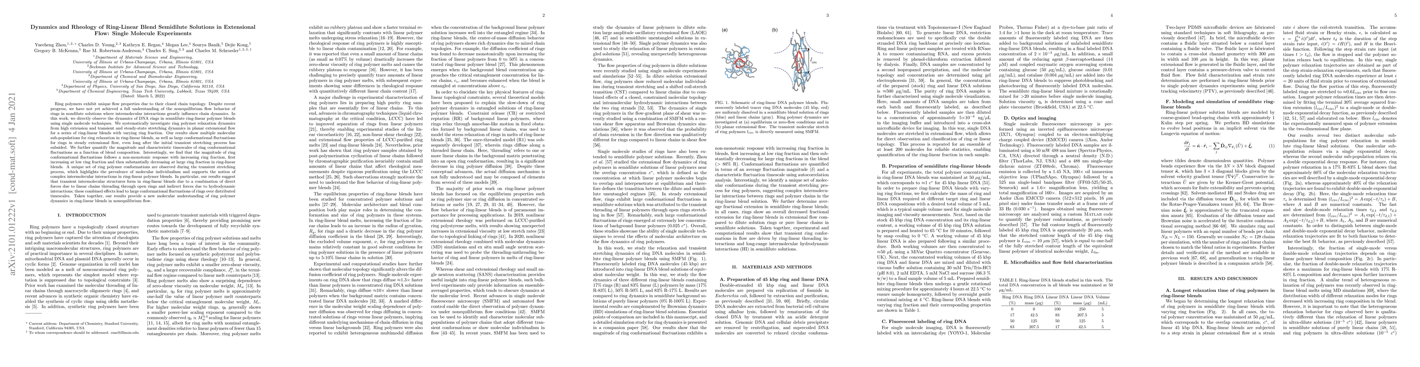 This study uses single molecule techniques to observe the dynamics of DNA rings in semidilute ring-linear polymer blends under extensional flow, revealing multiple relaxation sub-populations and significant conformational fluctuations. The magnitude of ring conformational fluctuations shows a non-monotonic response with blend composition, suggesting complex intermolecular interactions and hydrodynamic effects.