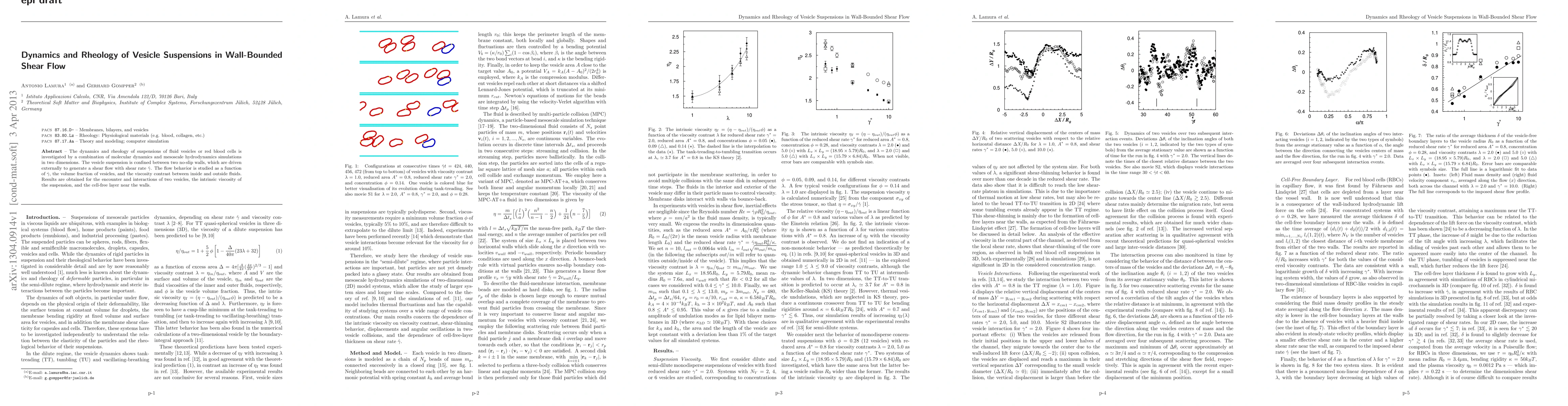 This study uses molecular dynamics and mesoscale simulations to explore the dynamics and rheology of vesicle suspensions under shear flow between two walls. The research focuses on how flow behavior varies with shear rate, vesicle volume fraction, and fluid viscosity contrast, revealing insights into vesicle interactions and the formation of a cell-free layer near the walls.
