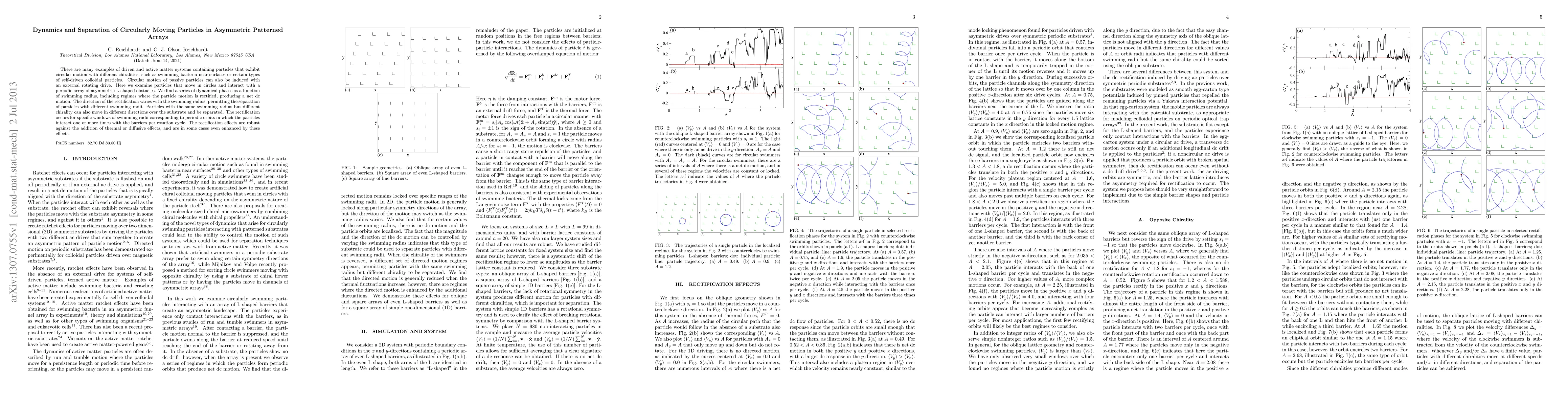 This paper investigates the dynamics of circularly moving particles in asymmetric patterned arrays, revealing distinct dynamical phases and rectification effects. The study demonstrates the separation of particles based on their swimming radius and chirality, with rectification occurring in specific radius windows linked to periodic particle-obstacle interactions.