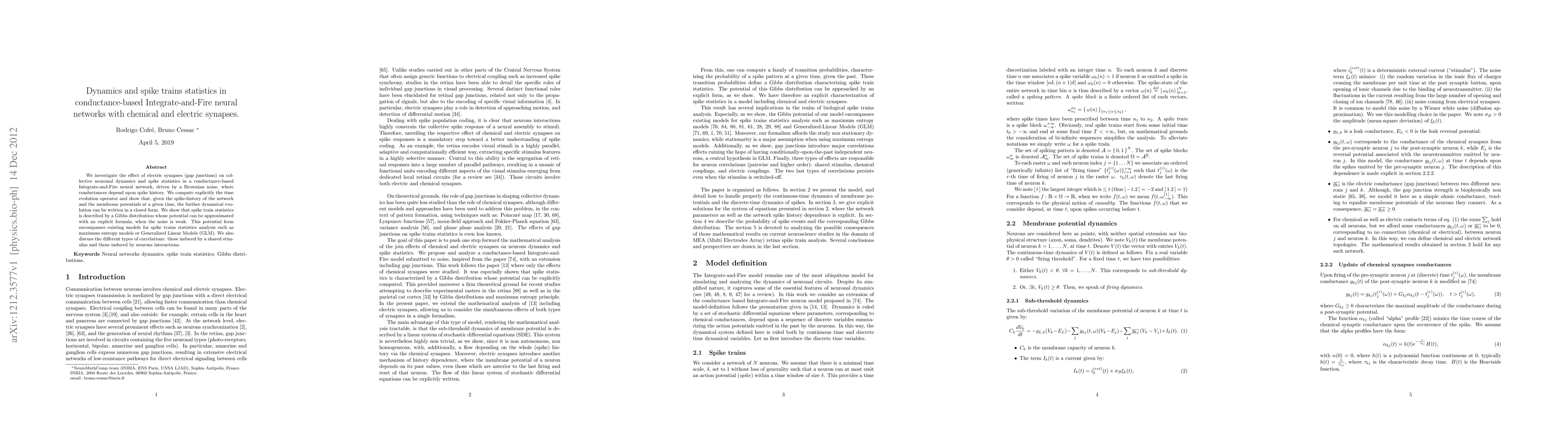 We investigate the effect of electric synapses (gap junctions) on collective neuronal dynamics and spike statistics in a conductance-based Integrate-and-Fire neural network, driven by a Brownian noise, where conductances depend upon spike history. We compute explicitly the time evolution operator and show that, given the spike-history of the network and the membrane potentials at a given time, the further dynamical evolution can be written in a closed form. We show that spike train statistics is described by a Gibbs distribution whose potential can be approximated with an explicit formula, when the noise is weak. This potential form encompasses existing models for spike trains statistics analysis such as maximum entropy models or Generalized Linear Models (GLM). We also discuss the different types of correlations: those induced by a shared stimulus and those induced by neurons interactions.