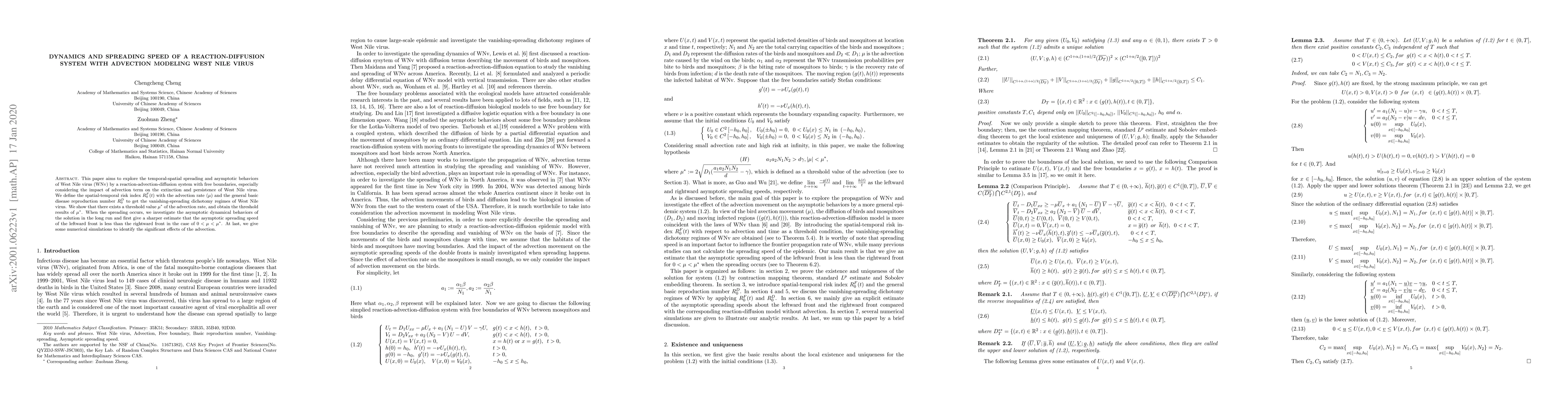 This paper investigates the dynamics and spreading speed of West Nile virus using a reaction-advection-diffusion system, focusing on the impact of advection. It establishes a threshold value for advection that determines the virus's extinction or persistence, and finds that the spreading speed of the leftward front is slower than the rightward front when spreading occurs.