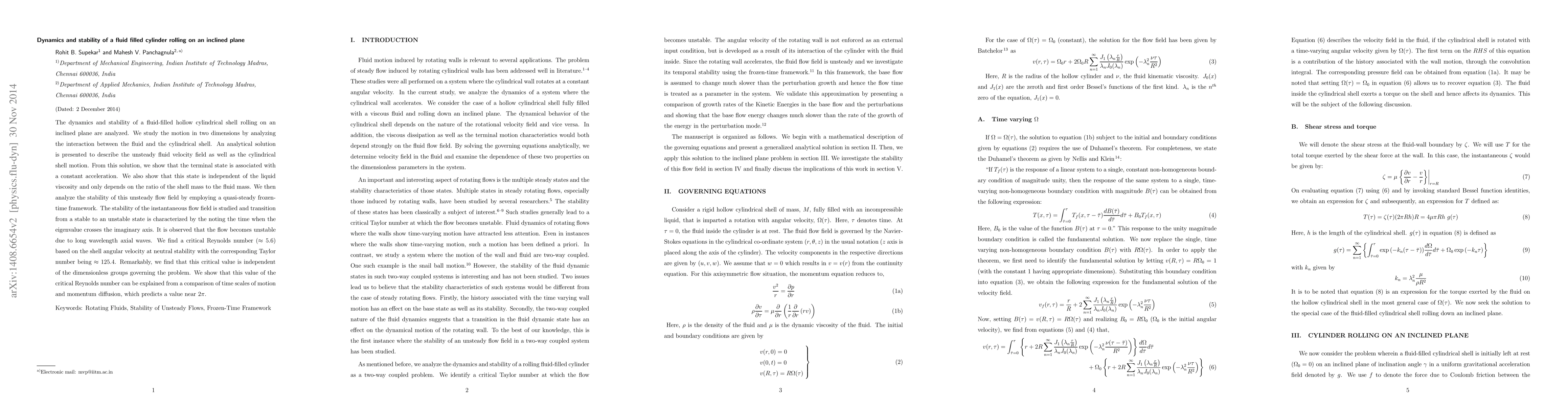 The dynamics and stability of a fluid-filled hollow cylindrical shell rolling on an inclined plane are analyzed. We study the motion in two dimensions by analyzing the interaction between the fluid and the cylindrical shell. An analytical solution is presented to describe the unsteady fluid velocity field as well as the cylindrical shell motion. From this solution, we show that the terminal state is associated with a constant acceleration. We also show that this state is independent of the liquid viscosity and only depends on the ratio of the shell mass to the fluid mass. We then analyze the stability of this unsteady flow field by employing a quasi-steady frozen-time framework. The stability of the instantaneous flow field is studied and transition from a stable to an unstable state is characterized by the noting the time when the eigenvalue crosses the imaginary axis. It is observed that the flow becomes unstable due to long wavelength axial waves. We find a critical Reynolds number ($\approx 5.6$) based on the shell angular velocity at neutral stability with the corresponding Taylor number being $\approx 125.4$. Remarkably, we find that this critical value is independent of the dimensionless groups governing the problem. We show that this value of the critical Reynolds number can be explained from a comparison of time scales of motion and momentum diffusion, which predicts a value near $2 \pi$.