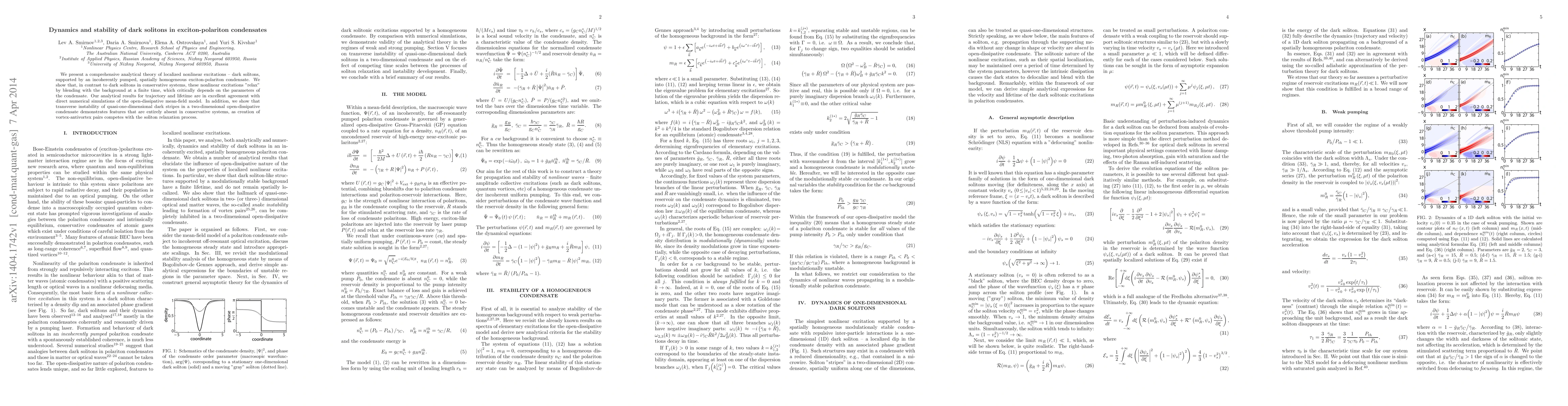 This paper develops an analytical theory for the dynamics and stability of dark solitons in exciton-polariton condensates, revealing their relaxation through blending with the background, contrasting with conservative systems. The study also highlights unique transverse instabilities and vortex-antivortex pair creation in quasi-one-dimensional dark stripes.