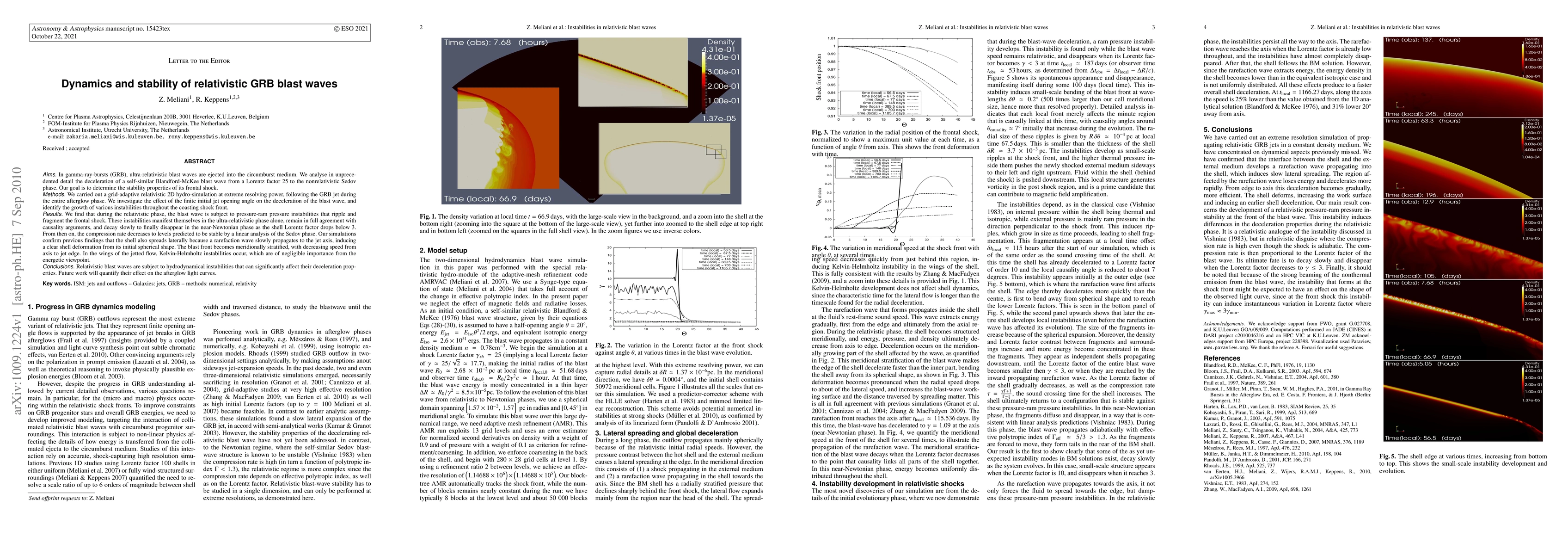 This paper analyzes the deceleration and stability of relativistic gamma-ray burst blast waves, revealing that pressure-ram pressure instabilities fragment the frontal shock during the ultra-relativistic phase. These instabilities decay as the blast wave transitions to the nonrelativistic Sedov phase, confirming the shell's lateral spreading and meridional stratification.