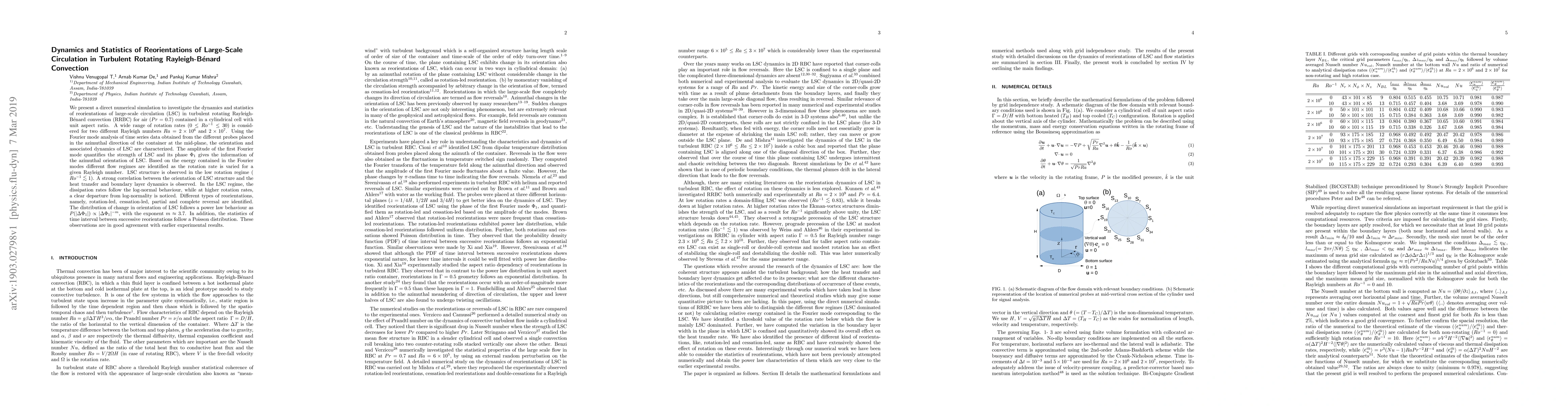This study uses direct numerical simulations to analyze the dynamics and statistics of large-scale circulation reorientations in turbulent rotating Rayleigh-Bénard convection. It reveals distinct flow regimes and reorientations, with a power law distribution for orientation changes and a Poisson distribution for reorientation intervals, aligning with previous experimental findings.