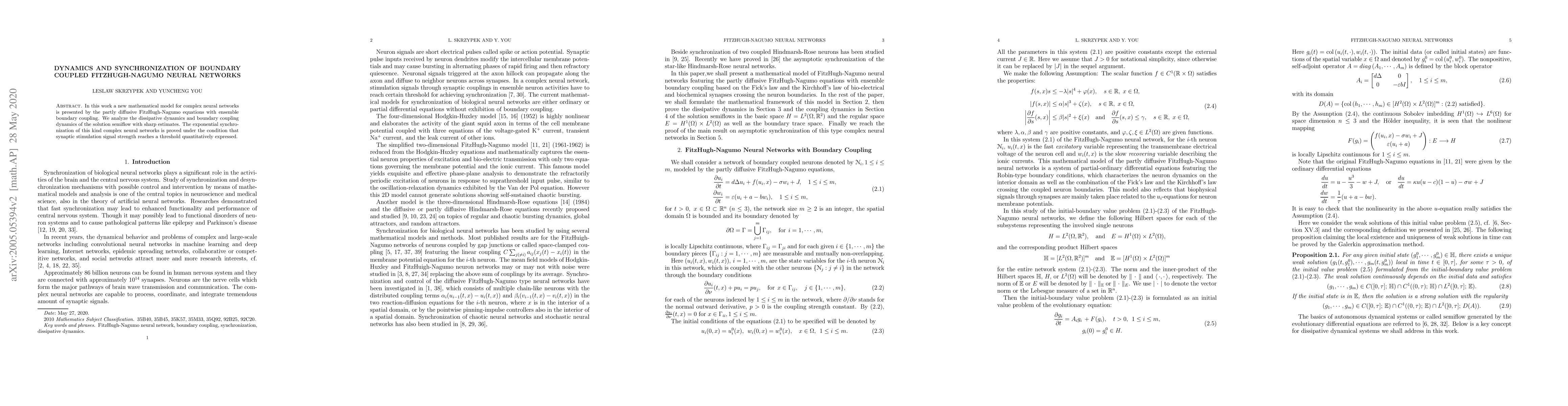 In this work a new mathematical model for complex neural networks is presented by the partly diffusive FitzHugh-Nagumo equations with ensemble boundary coupling. We analyze the dissipative dynamics and boundary coupling dynamics of the solution semiflow with sharp estimates. The exponential synchronization of this kind complex neural networks is proved under the condition that synaptic stimulation signal strength reaches a threshold quantitatively expressed.