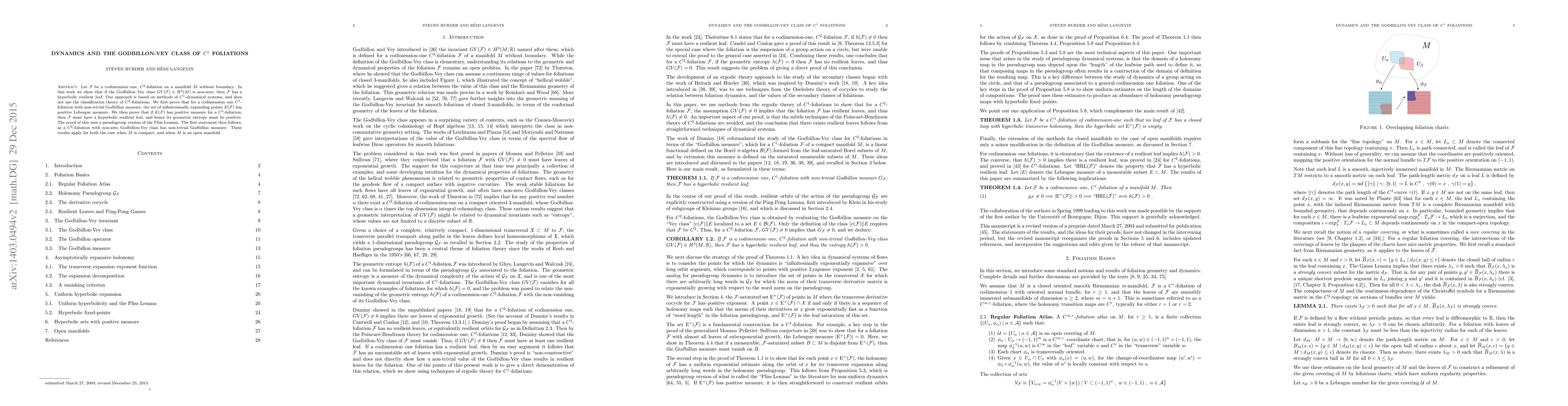 Let F be a codimension-one, C^2-foliation on a manifold M without boundary. In this work we show that if the Godbillon--Vey class GV(F) \in H^3(M) is non-zero, then F has a hyperbolic resilient leaf. Our approach is based on methods of C^1-dynamical systems, and does not use the classification theory of C^2-foliations. We first prove that for a codimension--one C^1-foliation with non-trivial Godbillon measure, the set of infinitesimally expanding points E(F) has positive Lebesgue measure. We then prove that if E(F) has positive measure for a C^1-foliation F, then F must have a hyperbolic resilient leaf, and hence its geometric entropy must be positive. The proof of this uses a pseudogroup version of the Pliss Lemma. The theorem then follows, as a C^2-foliation with non-zero Godbillon-Vey class has non-trivial Godbillon measure. These results apply for both the case when M is compact, and when M is an open manifold.