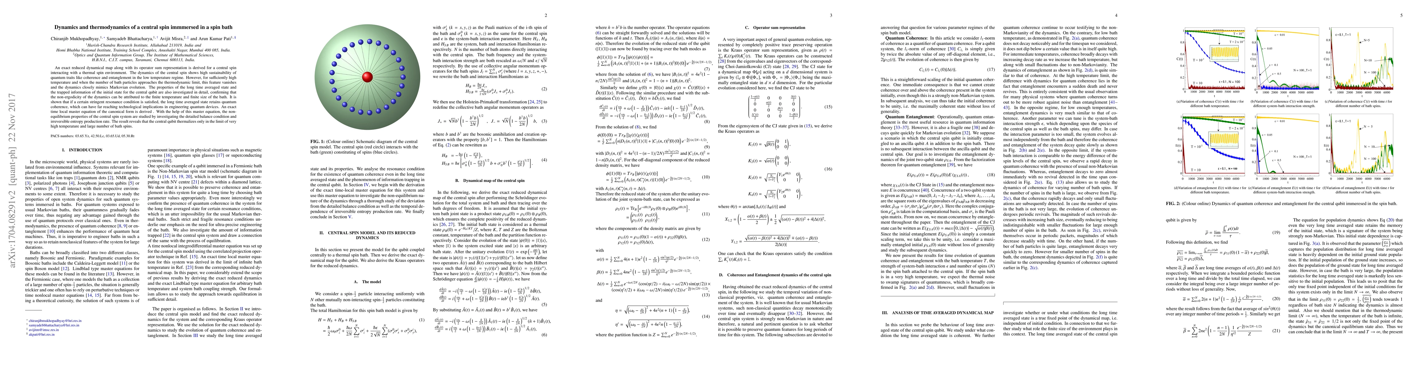 This paper derives an exact reduced dynamical map for a central spin interacting with a thermal spin bath, showing that quantum coherence and entanglement persist in low-temperature regimes but vanish at high temperatures. The study reveals that under specific resonance conditions, long-time-averaged states retain quantum coherence, with implications for quantum device engineering.