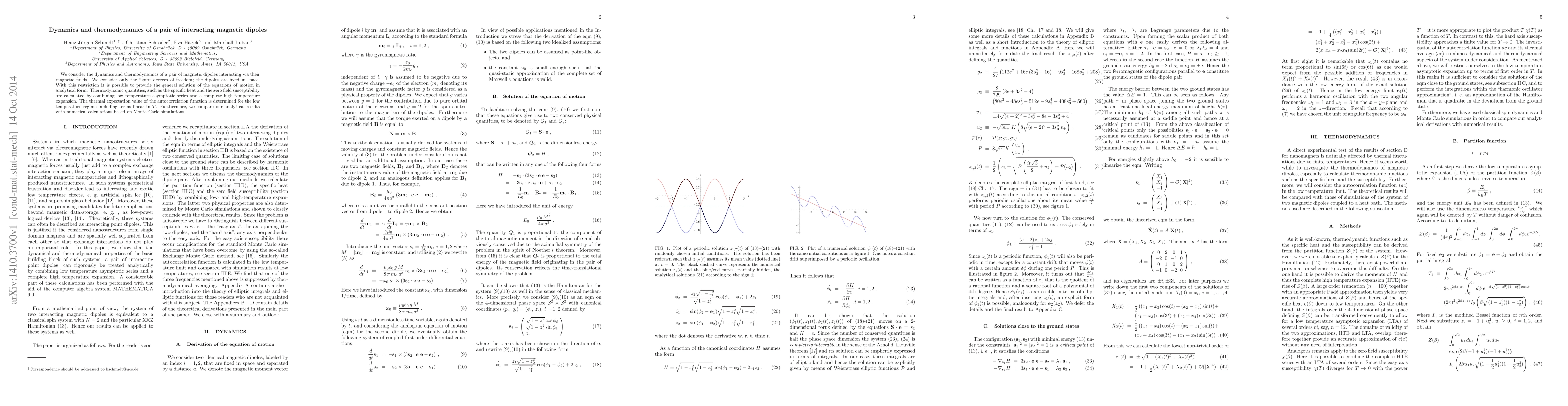 This research paper studies the dynamics and thermodynamics of two magnetic dipoles interacting via their magnetic fields, providing analytical solutions for specific heat and susceptibility at low and high temperatures.