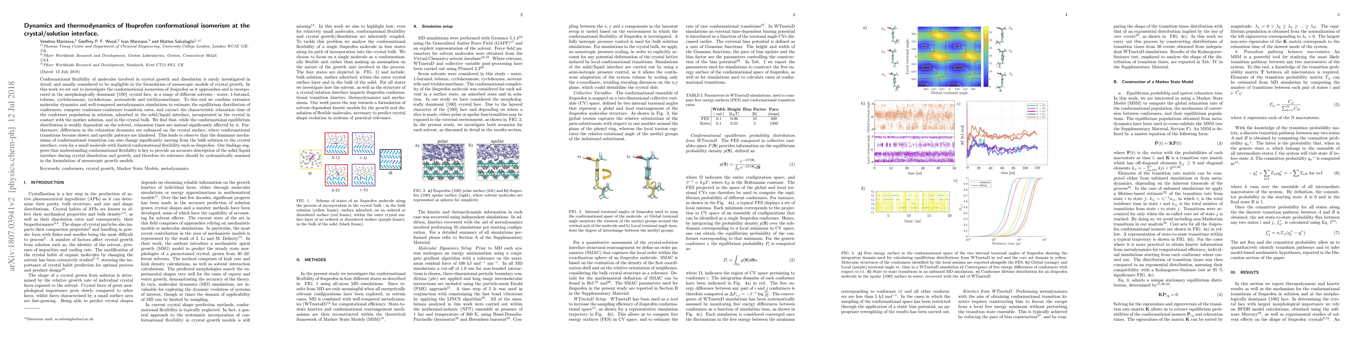 Researchers investigated ibuprofen conformational isomerism at the crystal/solution interface using molecular dynamics and metadynamics simulations. They found that conformational flexibility affects relaxation times significantly, changing mechanisms on the surface vs. in bulk solution.