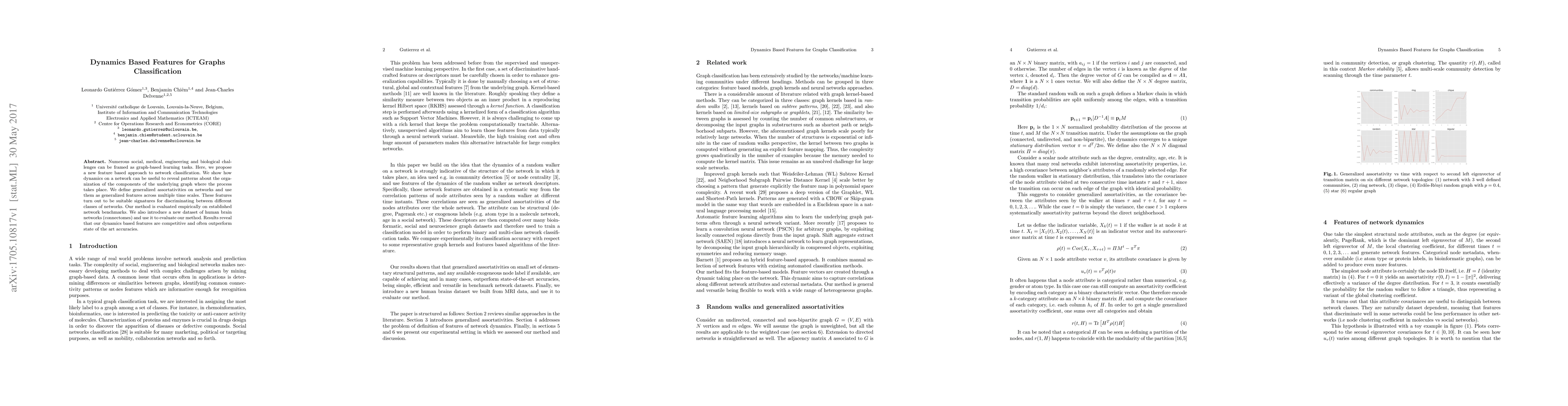 Numerous social, medical, engineering and biological challenges can be framed as graph-based learning tasks. Here, we propose a new feature based approach to network classification. We show how dynamics on a network can be useful to reveal patterns about the organization of the components of the underlying graph where the process takes place. We define generalized assortativities on networks and use them as generalized features across multiple time scales. These features turn out to be suitable signatures for discriminating between different classes of networks. Our method is evaluated empirically on established network benchmarks. We also introduce a new dataset of human brain networks (connectomes) and use it to evaluate our method. Results reveal that our dynamics based features are competitive and often outperform state of the art accuracies.